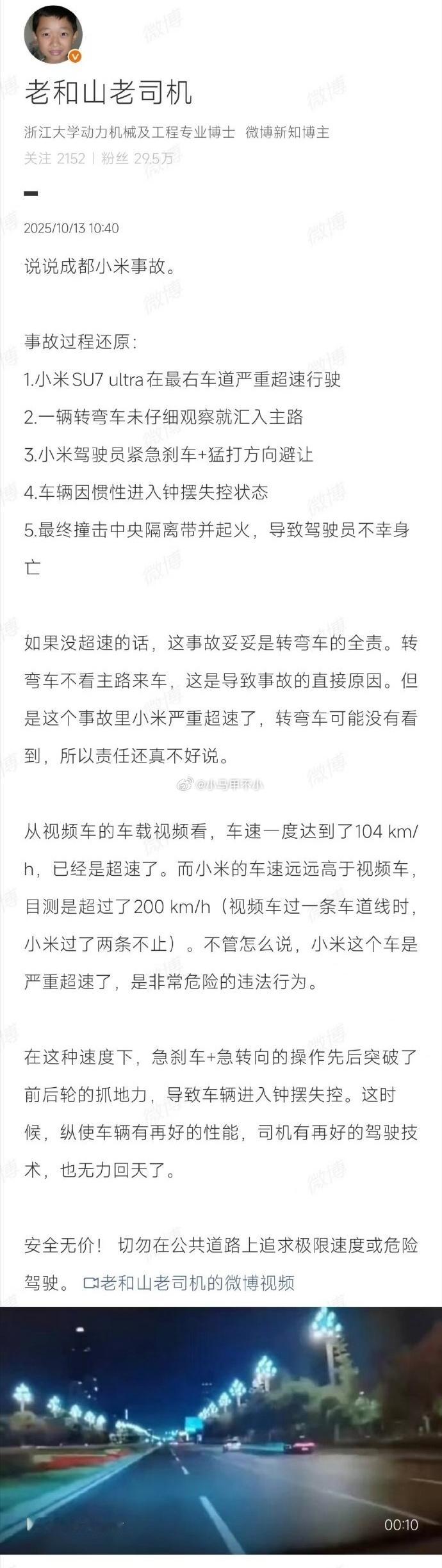汽车博主的分析:严重超速,紧急刹车转向避让转弯车,最终撞击隔离带。
