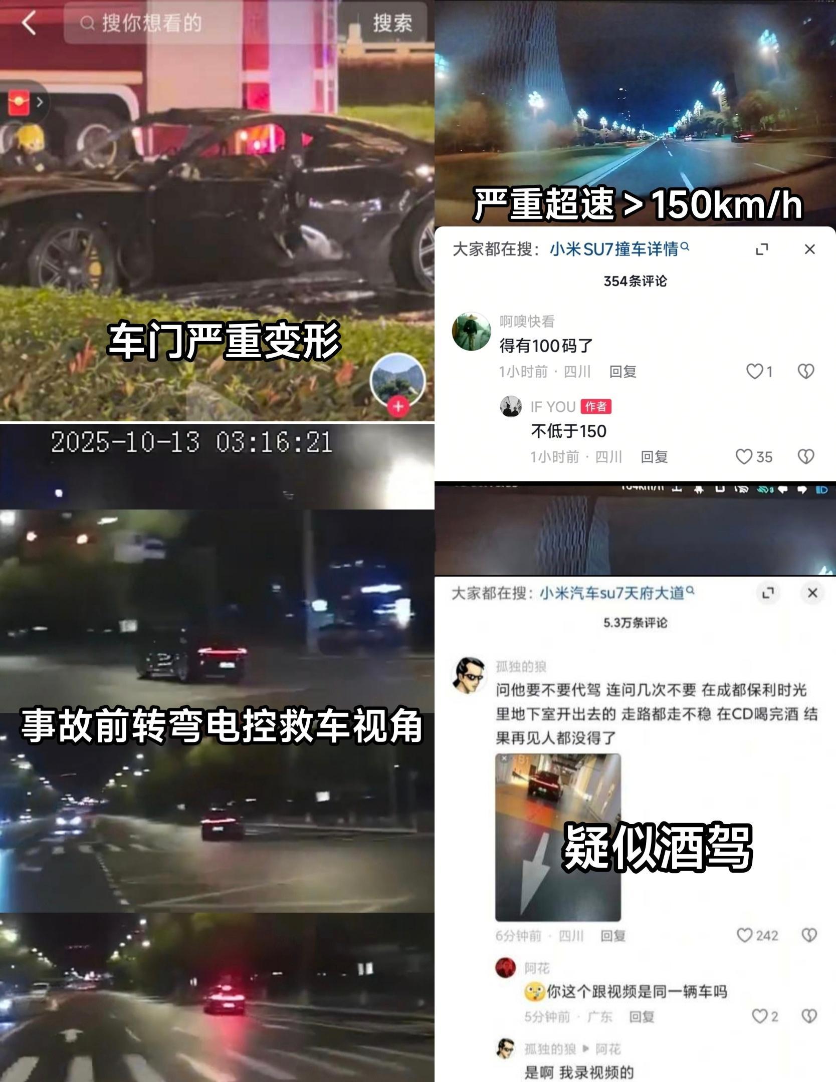 网传信息汇总:酒驾,严重超速,车门严重变形。