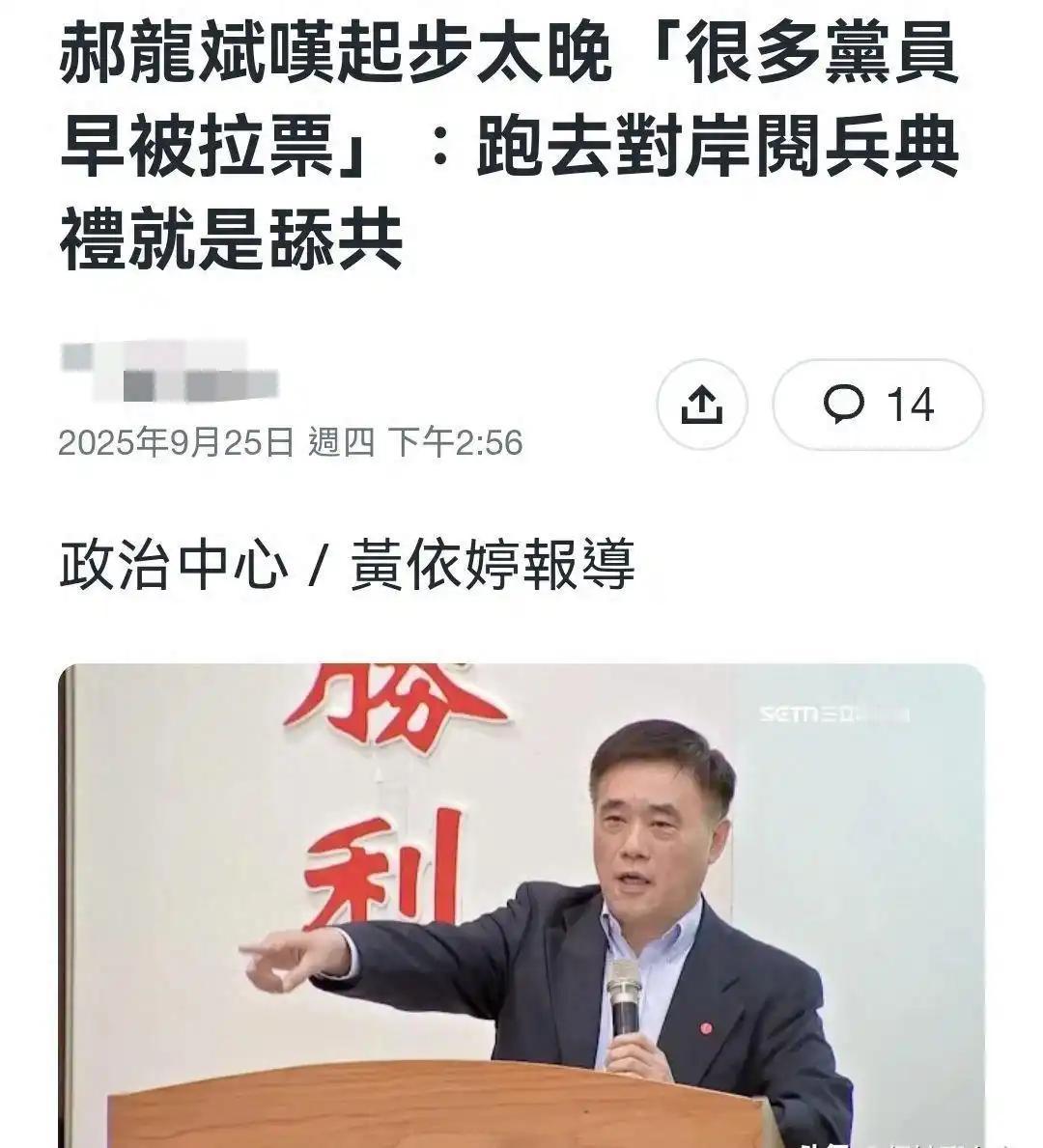 [下雨]郝龙斌再爆金句!在辩论会上,蔡正元教授提问郝龙斌,“何为舔共”,不料郝龙斌竟然回答,参加九三大阅兵就是! 郝龙斌在谈到“舔共”时把参加九三大阅兵直接贴上了标签,这种说法把高度政治化和历史问题搅在一起,很容易让人觉得历史成了某些人的工具。 九三大阅兵是整个中国纪念抗战胜利的活动,不属于哪一个政党,这是所有中国人为反抗外敌所付出的记忆。 这段历史本该成为所有中国人共同铭记的事实,当年抗战的胜利是靠大家一起拼出来的,不是某一方的功劳。 可郝龙斌这一句话,把这种集体记忆变得狭隘了起来,听起来不像是在缅怀历史,更像是在拆分民族认同。 拿这样一句话来说事,背后的逻辑就很耐人寻味。如果说参加大陆的纪念活动就是“舔共”,那国民党频频跑去日本访问,是不是也得打上“舔日”的标签? 台湾那帮人对外走动成了常态,有些人却只对大陆合作敏感,对别的国家就很宽容,这样的标准显然让人觉得根本不是从民族感情出发,反而更像是出于政治操作。 细看抗战那段历史,无论是国民党还是共产党,都为国家付出了巨大的牺牲。前线的国民党部队顶住了日本的猛烈攻击,而共产党开展游击战,大家一起把侵略者赶出家门。 抗日战争的胜利是无数先烈用命换来的,现在不少台湾年轻人已经对这段记忆相当模糊,如果连纪念抗战胜利的时候都要分彼此,会让下一代对历史越来越疏远。 还有一点容易被有意无意忽略。抗日战争结束后,该怎么面对日本?有些台湾政治人物在对日合作上相当主动,可对历史问题却选择不去多提。 日本的责任仿佛变得很轻,甚至不少交流都显得理所当然,对大陆举办抗战纪念活动却加上“舔共”这种标签,这就是标准的双标了。如果只挑一方发难,对历史的教育和民族认同只会更混乱。 事实上两岸在贸易、经济上依赖很深,无论政治怎么闹腾,都难以真正隔绝。合作本该是顺其自然的现实选择,可有的人怕得罪某个势力,往往什么话都能说出口。 这点从郝龙斌的话里就能看出,他宁可弱化历史上的大义,也要紧跟当前的岛内政治风向,其实很伤民族大局。 两岸同属中华民族,受益于同一段苦难历史,九三大阅兵不该只看成一场政治表演,它背后其实承载了几代中国人的记忆和共识。 当一些人一味用政治眼光去看待历史,还总是强调对立的时候,两岸的隔阂只会越来越大,而有关抗战和民族团结的共同记忆,也将消散在争吵和分歧中。 郝龙斌的观点代表了一种很典型的思路:只要是跟大陆有关系的事,不管什么意义,先上标签再说。这种说法虽然简单,但却让民族认同这个本来该很坚定的东西变得脆弱不堪。 正因为如此,台湾这些政客不该把这类纪念活动当成政党之争的场子,更不能用“舔”这种词汇去矮化为民族做出贡献的人。 只有认识到这一点,民族认同和共同记忆才能被好好保存下来,不会被随便一句话给切割开。