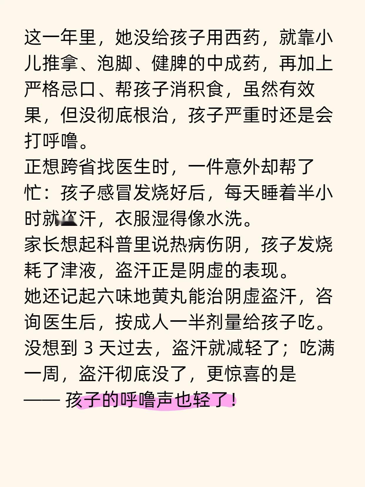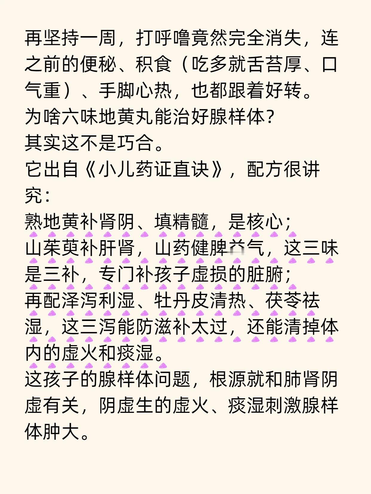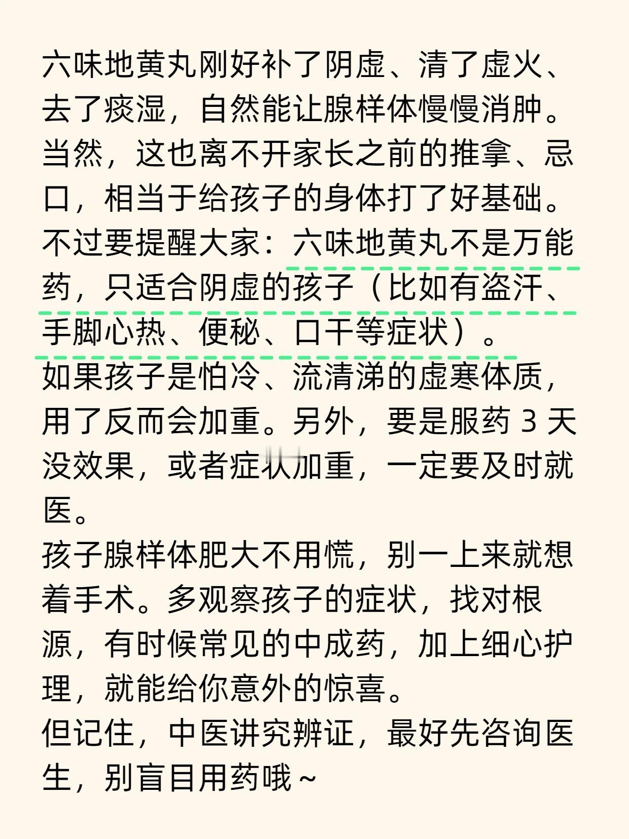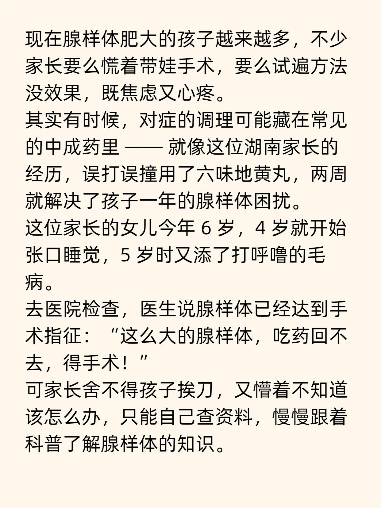 误打误撞,一个中成药 “连根拔起”,竟然治好了孩子的腺样体肥大! 现在腺样体肥大的孩子越来越多,不少家长要么慌着带娃手术,要么试遍方法没效果,既焦虑又心疼。其实有时候,对症的调理可能藏在常见的中成药里 —— 就像这位家长的经历,误打误撞用了六味地黄丸,两周就解决了孩子一年的腺样体困扰。 这位家长的女儿今年 6 岁,4 岁就开始张口睡觉,5 岁时又添了打呼噜的毛病。去医院检查,医生说腺样体已经达到手术指征:“这么大的腺样体,吃药回不去,得手术!” 可家长舍不得孩子挨刀,又懵着不知道该怎么办,只能自己查资料,慢慢跟着科普了解腺样体的知识。 这一年里,她没给孩子用西药,就靠小儿推拿、泡脚、健脾的中成药,再加上严格忌口、帮孩子消积食,虽然有效果,但没彻底根治,孩子严重时还是会打呼噜。正想跨省找医生时,一件 “意外” 却帮了忙:孩子感冒发烧好后,每天睡着半小时就盗汗,衣服湿得像水洗。 家长想起科普里说 “热病伤阴”,孩子发烧耗了津液,盗汗正是阴虚的表现。她还记起六味地黄丸能治阴虚盗汗,咨询医生后,按成人一半剂量给孩子吃。没想到 3 天过去,盗汗就减轻了;吃满一周,盗汗彻底没了,更惊喜的是 —— 孩子的呼噜声也轻了!再坚持一周,打呼噜竟然完全消失,连之前的便秘、积食(吃多就舌苔厚、口气重)、手脚心热,也都跟着好转。 为啥六味地黄丸能治好腺样体?其实这不是 “巧合”。它出自《小儿药证直诀》,配方很讲究:熟地黄补肾阴、填精髓,是核心;山茱萸补肝肾,山药健脾益气,这三味是 “三补”,专门补孩子虚损的脏腑;再配泽泻利湿、牡丹皮清热、茯苓祛湿,这 “三泻” 能防滋补太过,还能清掉体内的虚火和痰湿。 这孩子的腺样体问题,根源就和肺肾阴虚有关,阴虚生的虚火、痰湿刺激腺样体肿大。六味地黄丸刚好补了阴虚、清了虚火、去了痰湿,自然能让腺样体慢慢消肿。当然,这也离不开家长之前的推拿、忌口,相当于给孩子的身体打了好基础。 不过要提醒大家:六味地黄丸不是 “万能药”,只适合阴虚的孩子(比如有盗汗、手脚心热、便秘、口干等症状)。如果孩子是怕冷、流清涕的虚寒体质,用了反而会加重。另外,要是服药 3 天没效果,或者症状加重,一定要及时就医。 孩子腺样体肥大不用慌,别一上来就想着手术。多观察孩子的症状,找对根源,有时候常见的中成药,加上细心护理,就能给你意外的惊喜。但记住,中医讲究辨证,最好先咨询医生,别盲目用药哦~