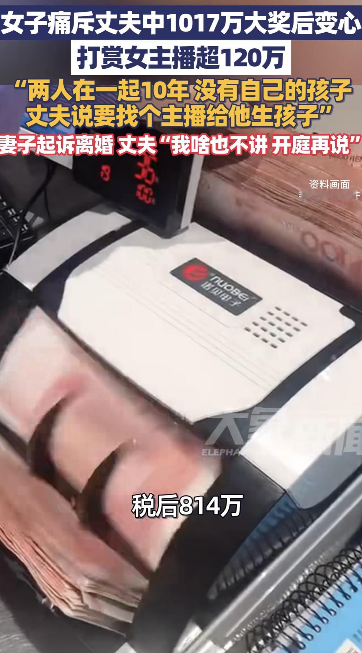 “真不该有钱!”山东德州,一男子花42元买彩票,竟然中了1000万,税后得了814万,他中奖第3天,就把现金取走了,然后给了老婆一张卡,说里面存了300万,用于2人养老,妻子信以为真,可她发现男子从此就飘了,天天出去打牌,整夜刷美女,给不同的女主播打赏了120万,却一分都不舍得给妻子花,妻子去银行一查,才发现男子给的卡里,压根没有300万,余额为0,妻子大怒离婚,要求男子必须把814万分她一半。妻子哭诉:真不该有钱,如果没中彩票的话,我是想跟他过一辈子的。 “真不该有钱”是来自一位女士的呐喊! 据大象新闻10月11日报道,一名男子中千万大奖之后,飘了起来,不仅仅背叛了妻子,甚至还大手挥霍这笔钱,导致最后分文不剩。 王女士(化名)在与丈夫结婚的时候并没有太在意丈夫经济能力,而是觉得他不是那种花言巧语的人,老老实实的能够过一辈子。 然而令他想不到的是,就在去年,经常买彩票的丈夫竟然中了千万大奖,扣除所有的税之后,落手也有800多万。 夫妻俩人看到这件事情之后,觉得真的是太幸运了,很是高兴,于是在中奖第三天的时候,丈夫就迫不及待的起去兑了奖,随后后回到家,丈夫就直接甩给了王女士一张银行卡说里面有三百万。 让王女士帮忙保管着等以后老了两人养老用,王女士觉得自己的丈夫老老实实一辈子了,肯定不会使什么坏心思就将这张银行卡直接放了起来,没有去查看里面是否有金额。 但没过多久,王女士就察觉到了不对劲,丈夫有了这笔钱之后,越来越飘了,不仅说话的语气变得豪横了甚至还经常夜不归宿,半夜的时候刷美女直播,在直播间里打赏。 就这样王女士看着钱一点点的被丈夫挥霍掉,与丈夫大吵了一架,不料丈夫根本就没把王女士的话记到心里面直接就去找了女主播。 直到王女士发现之前给的那张银行卡里面根本就没有钱的时候,立马就寒了心,觉得丈夫没有心,已经不再是她之前那个值得依靠的男人了。 很多网友看到了这件事情之后,纷纷在下面评论,有一些网友在下面说王女士的丈夫之所以会做出这样的事情其实并不惊讶,因为彩票中奖属于突然暴富,所以他们一时间根本就无法控制自己的欲望。 还有一些网友在下面说,在婚姻期间中彩票的所有钱都属于两人的夫妻共同财产,所以支持王女士向法院提起诉讼,问丈夫要回属于自己的那部分钱。 不管怎么样,中彩票当然是一件值得开心的事情,但要是因为这笔钱让夫妻二人的关系破裂,生活发生了很大的改变,那得不偿失。 那么,对此你还有什么看法呢?