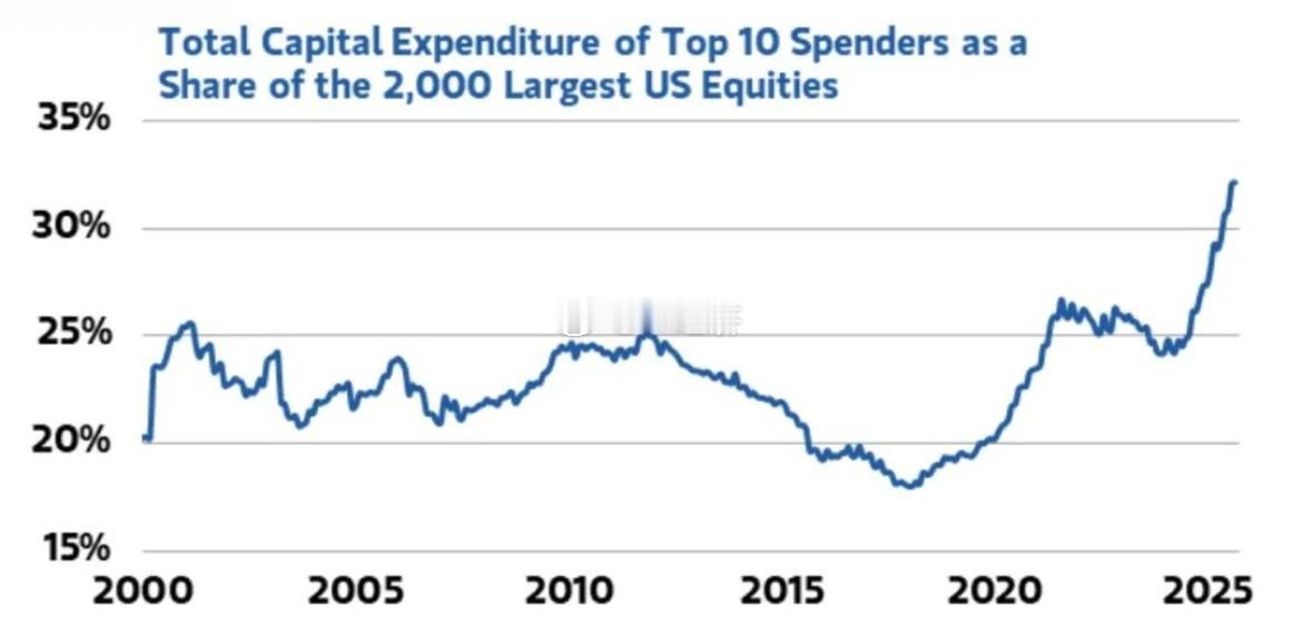 摩根士丹利:美国企业资本支出的集中度已达到历史新高,最大的10家公司占据了美国市值最高的2000家公司总资本支出的近三分之一(约32%)。