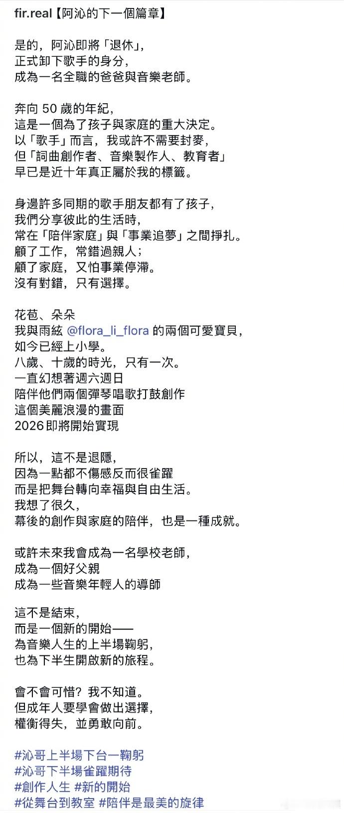 阿沁宣布退圈 13日,飞儿乐团前成员阿沁突然宣布退圈,称“正式卸下歌手的身份,成为一名全职爸爸和音乐老师”,他并强调这不是隐退,把舞台转向幸福与自由生活他考虑了很久。飞儿乐团前成员阿沁退圈