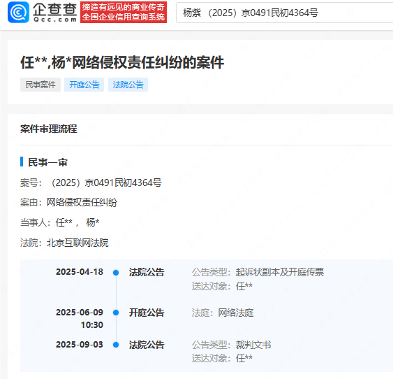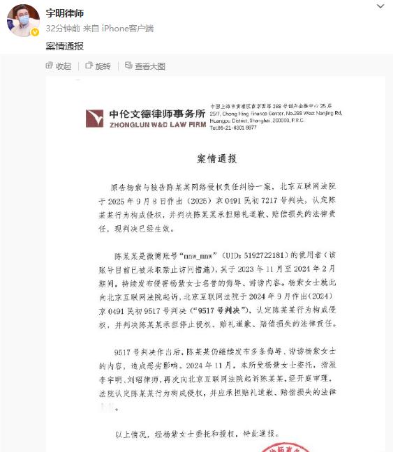 【一网民两次被判侵权杨紫】杨紫维权最新进展10月13日,杨紫方代理律师发布案情通报,陈某某在被法院认定构成侵权,并判决停止侵权、赔礼道歉、赔偿损失后,仍持续发布多条侮辱、诽谤杨紫的内容。杨紫方再次对其提起诉讼,经法院审理认定陈某某行为构成侵权,并应赔礼道歉、赔偿损失。此外,企查查APP显示,杨紫起诉任某某一案法院已向被告公告送达裁判文书。