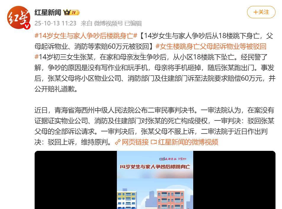 青海,14岁的初三女生,回到家中就不想写作业, 玩起手机更是把这件事给忘了,母亲一看,火冒三丈,就骂了她一顿,女生也不服气,和母亲吵了起来,紧接着就跑了出去,等母亲找到她,她已经从18楼一跃而下,事后女生父母将小区物业,消防部门,住建部门告上法庭,要求赔偿60万,还要公开道歉。 又是鸡飞狗跳的时刻,小张和母亲又吵了起来了,母亲火冒三丈,作为一名母亲,看到14岁的女儿,都已经初三了,还不知道把学习放在第1位,还不知道回来就先把作业写了,她实在是控制不了自己的脾气。 这位母亲非常看重学习,她很清楚女儿已经初三,但凡女儿在初三这一年,如果不努力一点,就有可能被分流到职校去了。 她也很清楚女儿到职校去会是什么样的人生,职校大都是学习不太好的孩子,可能都是在家玩手机没有节制的孩子,去到那里,她觉得应该不会有哪个孩子还会认真学习,大概率也就是在那里玩手机,谈恋爱了。 十五六岁的孩子,谈个两三年恋爱,也不知道能不能学到东西就走向社会。 她不希望自己的女儿的人生是这样的,她不希望自己的女儿过早谈恋爱,也不希望女儿早早步入社会,吃生活的苦。 在她看到女儿玩手机的那一刻,她似乎已经看到了女儿没有出息的一生,她无法接受,她一开始还能苦口婆心地和女儿说话,劝她不要再玩手机了,好好把作业写了。 可小张玩得正欢,一看见母亲又过来阻止她玩手机,怒火也从心中升起,她一开口就是顶嘴,和母亲吵了起来。 母亲本就火冒三丈,她好说歹说女儿都不听,现在女儿还和她吵了起来,她也就和女儿吵了起来了。 母女之间,争吵起来,互不相让,正是谁说谁有理,母亲说女儿玩手机没前途,脑子里没有学习这回事,女儿说母亲管得太严,没有自由,很压抑,需要玩手机,释放不愉快的情绪。 两人争吵的点就是对立的,谁也说服不了谁,怒气之中,小张吵不过母亲,气得夺门而出。 母亲也气在头上,看着女儿跑了出去,就没有跟着出去,只是让儿子出去找姐姐。 这下事情严重了,小张和母亲吵了之后,她根本就想不通,也不知道自己错在哪里,只感到母亲在压制她,在严管着她,不顾她的感受,她是越想越委屈。 她一口气上了18楼,等她的弟弟找到她时,她连手都没有向弟弟挥一挥,就一跃而下,结束了自己14年的人生。 可怜的孩子,心里承受能力太差了,只是和母亲吵架,只是不得玩手机,就要以结束生命来威胁母亲。 可是小张,才14岁,她以死来让母亲愧疚,她也付出了自己的生命,这不值得呀。 发生这样的悲哀,小张的母亲和父亲自然是十分痛心的,特别是她的母亲,早知道女儿会如此极端,她就不会和女儿吵架了。 可后来她想了一下,她女儿之所以这么轻易就结束自己的生命,这与小区物管,消防部门,住建部门,有很大的关系,如果他们的安全措施做得周到,她的女儿根本就爬不上18楼,也不会有机会一跳下去,失去生命。 于是她就起诉了这三方,要求他们赔偿60万,并且公开道歉。 那么小张的父母的诉求是否会得到支持? 1、如果要他们进行赔偿,那么则要证明这三方对小张的死有因果关系,或者侵权行为,或者有过错,她要拿出证据。 《民事诉讼法》第67条规定:当事人对自己提出的主张,有责任提供证据。 具体到本案中,小张坠楼的原因是和母亲争吵,因果关系是因为和母亲争吵,才想着结束自己的生命,所以小区物管,消防部门和住建部门,他们是没有过错的,不需要承担责任,小张父母如果无法举证,则不能追究别人的责任。 2、本案中,其实最根本的原因是因为小张的母亲没有注意自己的教育方式,导致女儿做出这样的事情,所以小张的母亲是有过错的。 《民法典》第1165条规定:行为人因过错侵害他人民事权益造成损害的,应当承担侵权责任。 小张的母亲没有注意自己过错,把过错都推给别人,这也是不对的。 法院经过审理认为,小区物管,消防部门以及住建部门,对小张的死并没有因果关系,所以驳回了小张父母的诉讼请求。 但他们不服,进行了上诉,只不过二审依然维持原判。 那么发生这样的事,你认为问题出现在哪呢?来源:红星新闻 2025.10.13