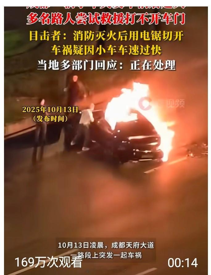成都车辆起火目击者称车主未能救出多方回应车辆起火路人救援打不开门 10月13日凌晨,成都天府大道一路段上突发一起车祸。一名现场目击者告诉记者,他是跟消防车一起到的,约在凌晨3点半,“到的时候火已经控制住了,但是中间火势变大,最后也灭了。人没有救出来,最后是用电锯切开的门。”