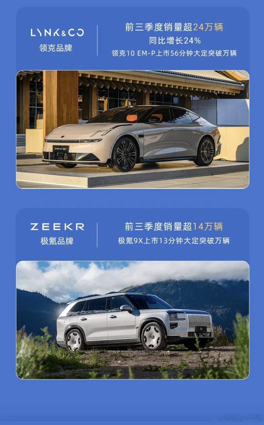 按品牌来看,今年前三季度,吉利银河销量87.5万辆,同比增长206%;领克品牌销量超24万辆,同比增长24%;极氪品牌销量超14万辆。
