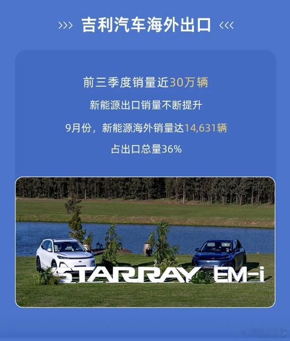 此外,在海外市场,吉利前三季度出口近30万辆,其中新能源出口销量不断提升。9月份,吉利新能源海外销量达14,631辆,占出口总量36%。吉利汽车汽场全开