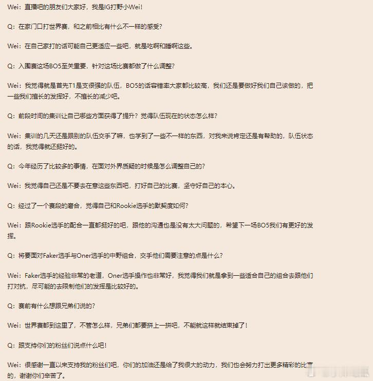 S15全球总决赛媒体日活动,iG打野选手Wei接受媒体采访。在采访中,Wei表示T1是一支很强的队伍,但BO5大家的容错率都比较高,要发挥好队伍擅长的部分,拿到适合己方队伍的阵容去进行对抗。谈到一年来各种波折引发的舆论时,Wei表示不要去在意这些内容,打好自己的比赛,要坚守好自己的本心。