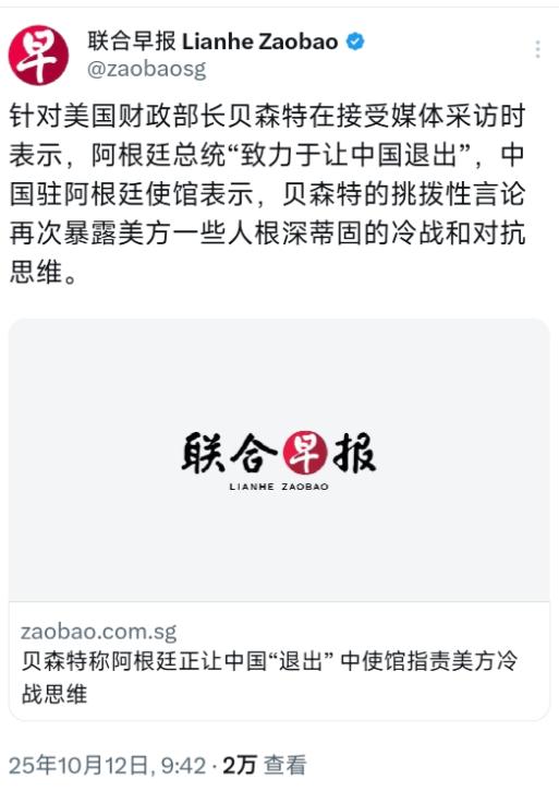 外媒10月12日报道:“针对美国财政部长贝森特在接受媒体采访时表示,阿根廷总统‘致力于让中国退出’,中国驻阿根廷使馆表示,贝森特的挑拨性言论再次暴露美方一些人根深蒂固的冷战和对抗思维。” 美国这波操作纯属自己给自己加戏,贝森特在福克斯新闻上说得有板有眼,声称米莱承诺要把中国挤出阿根廷,还想把阿根廷打造成“拉美灯塔”来遏制中国影响力,结果话音刚落就被现实狠狠打了脸。 中国驻阿根廷使馆直接点破美方这是老掉牙的冷战套路,满脑子对抗思维,根本不看看实际情况。 其实米莱心里门儿清,阿根廷的经济根本离不了中国市场,哪儿能真听美国的瞎指挥。作为全球第三大大豆生产国,大豆出口占了阿根廷农产品出口的45%,简直是外汇收入的命根子。 2024年就因为美元债和通胀问题,大豆出口跌了18%,外汇储备差点见底,这种时候放着中国这个全球最大大豆进口国不合作,不是跟自己过不去吗? 就在贝森特放话的前几天,一艘装着130万吨阿根廷大豆的货轮刚从布宜诺斯艾利斯港出发,直奔中国山东日照港。 这可是米莱上台后最大的一笔对华农产品订单,从头到尾没美国什么事儿——种植用的是阿根廷本土培育的“阿根廷33号”种子,没沾美国孟山都的转基因品种;企业是本土控股,避开了美国农业巨头的插手;连结算都是人民币,全程绕开美元波动的风险。 为了促成这单生意,米莱政府特意协调海关简化通关流程,还让央行设了专项外汇账户,就怕耽误企业收款。 这130万吨大豆可不是小数目,相当于阿根廷2024年对华全年出口量的35%,一下子就把在华市场份额从3.9%拉到了5.2%。 更实在的是,这单能给阿根廷带来8亿美元外汇,还能带动种植、物流、港口一堆行业,造出1.2万个临时岗位,这种实打实的好处,美国可给不了。 米莱自己都公开说,今年要把对华大豆出口提到500万吨,比去年涨40%,这哪儿是要“让中国退出”的样子? 阿根廷内阁首席部长弗兰科斯更直接,被问起这事时干脆说没见过什么“排华协议”,阿根廷要的是独立自主,跟美国合作归合作,但绝不能断了和中国的往来。 他还特意提了中阿货币互换协议好好的,没理由终止,等于直接打了贝森特的脸。 说白了,美国就是把拉美当成自己的后院,想让各国都听自己的,可现在早就不是那个能随便指手画脚的年代了。 中拉合作从来不是玩对抗,而是实打实搞项目。中国要保障粮食安全,正好需要多找些进口来源;阿根廷要赚外汇促就业,正好有优质大豆可卖,双方一拍即合。 美国与其在旁边挑拨离间,不如想想怎么真的帮拉美国家解决点发展问题,光靠嘴皮子耍威风,最后只能是自己尴尬。 贝森特大概没料到,自己想耍的地缘政治小聪明,反倒让大家看清了美国的霸道和中阿合作的底气。米莱就算再激进,也不会跟自己的经济命脉过不去,毕竟谁给实惠就跟谁合作,这是最基本的道理。 美国以为喊几句口号就能操控别国关系,结果碰了一鼻子灰,这算盘算是彻底打空了。
