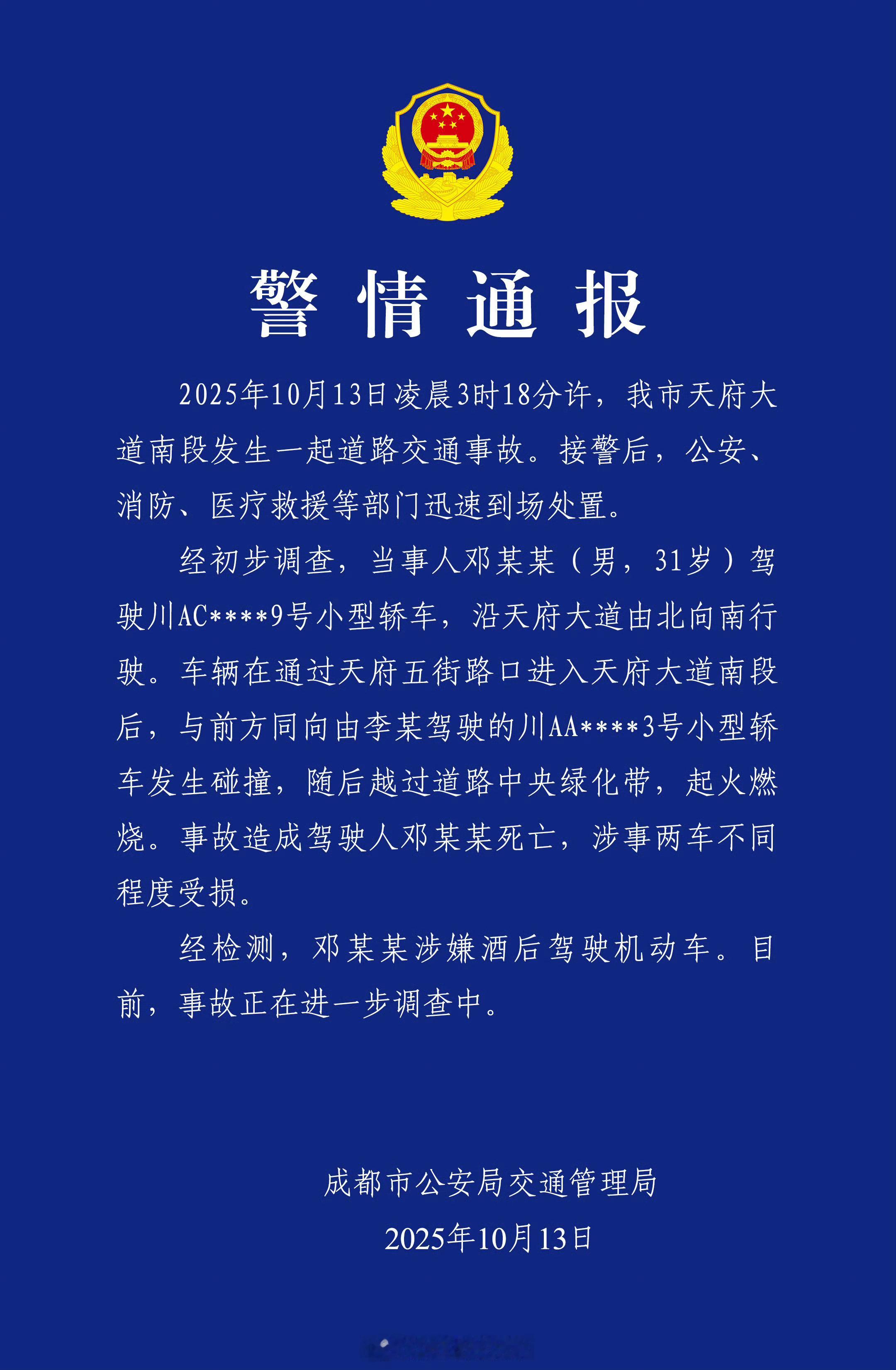 成都警方通报一车辆失控后起火开车不喝酒,喝酒不开车🙏生命第一位,安全第一位🙏