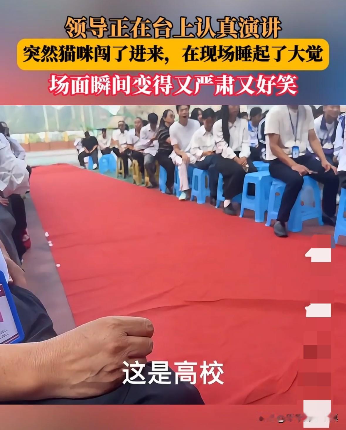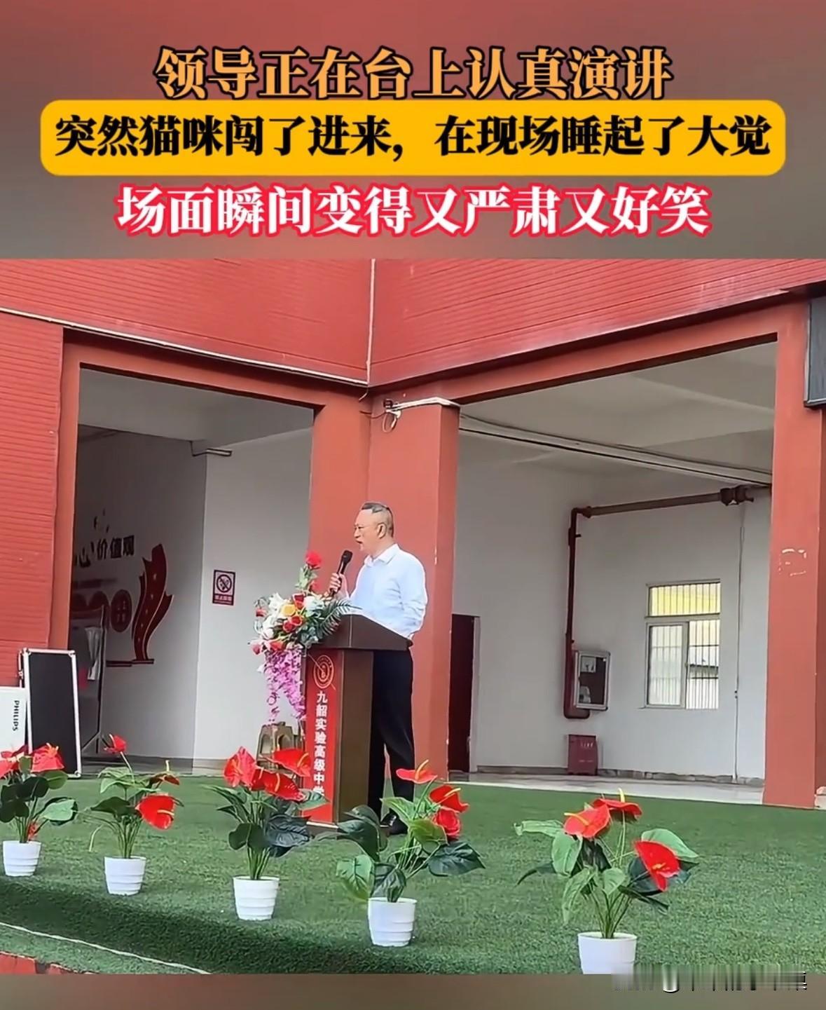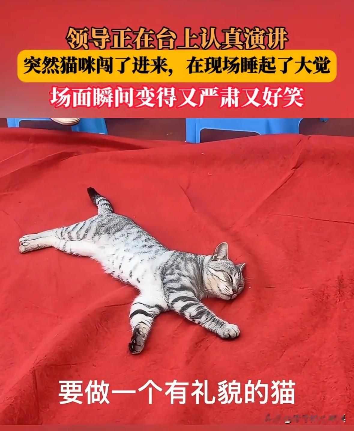领导正在台上认真演讲,这时候突然跑过来一只猫,听了没两句,直接躺在地上睡着了。而