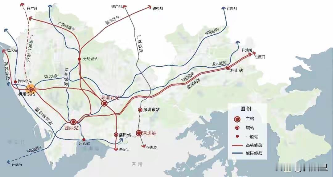 不得不说,深圳宝安机场东高铁站的定位太低了,应该作为深圳主枢纽站进行打造,而不是定位为辅站!先暂且不说西丽站是不是与深圳北站重复建设的事!先看机场东的实际情况。机场东站位于深圳西部的宝安,首先宝安作为深圳人口最大的一个区,有460万人口,相当于内地一个地级市的人口,却一直没有一个高铁站,现在的机场东只是一个辅站,并且未来大多以城际为主,缺乏省级出行线路,有必要提升为主高铁站来服务这庞大的人口。宝安作为深圳西部的重点,北上可承接最繁忙的广州南站,广州北站,拓展深圳南北走向的国家级干线高铁通道(深永高铁为例),西可跨越珠江口到中山江门等,撑起深圳东西走向的高铁框架,其辐射服务范围高于西丽站。最后,最大特点就是与深圳机场的组合,可以直接让珠江西岸和东莞惠州的旅客到达机场,提升深圳机场的辐射力和客源腹地。