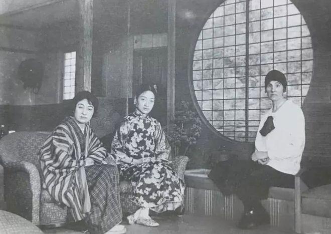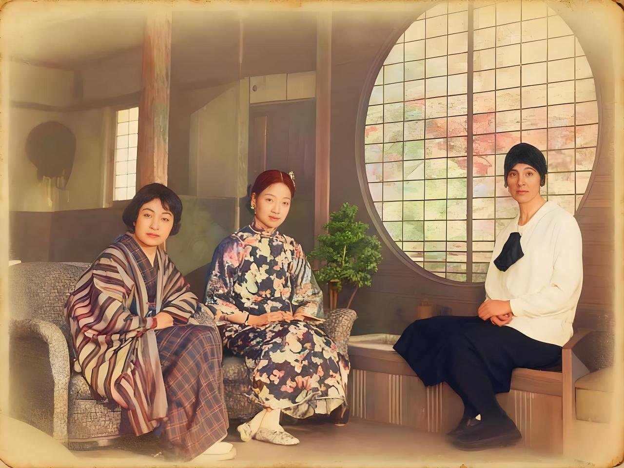 照片中的婉容身处天津,面容尽显病容与憔悴,往昔的光彩似乎被病痛与愁绪所掩盖。她身旁,右侧的女人身着和服,带有鲜明的日式服饰风格;而更靠右的,则是她的英文女教师,整体场景在室内环境的映衬下,传递出一种复杂且略带压抑的氛围,仿佛也暗示着婉容当时的处境与心境。