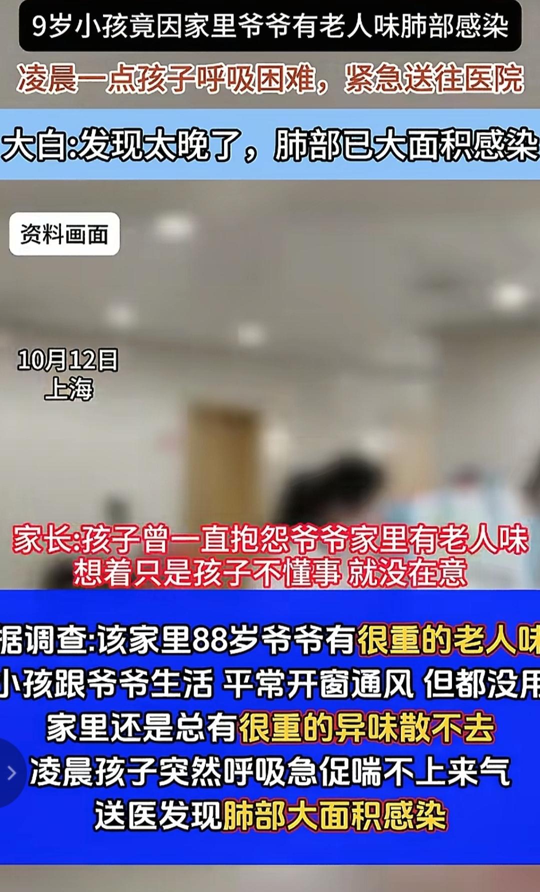 别让家里“老人味”成为健康的隐形杀手! 话题:上海一名9岁男孩因长期与有“老人味”的爷爷同住,突发肺部大面积感染,险些危及生命。 这个令人痛心的案例,撕开了一个被无数家庭忽视的健康盲区——“老人味”不是小事,而是需要警惕的健康信号。 “老人味”并非单纯的体味,而是由多种因素共同作用产生的。老年人新陈代谢减缓,皮肤分泌物易氧化产生特殊气味,若日常清洁不到位,加上居家环境密闭,细菌、尘螨等容易滋生,这些微小颗粒和刺激性气体会悬浮在空气中,形成潜在的呼吸道刺激源。 儿童的呼吸道非常娇嫩,免疫系统还没发育好,长期呼吸这种空气,很容易引发过敏、咳嗽,甚至像上海9岁男孩那样,导致严重的肺部感染。 这个案例像一个警钟,狠狠敲醒了我们。很多人以为“老人味”只是不好闻,忍忍就过去了,但它背后可能藏着看不见的健康杀手! 秋日领花茶我领到了秋日限定花茶:桂子落泉煮秋月,菊盏浮香暖晚风,戳这里👉快来领取你的专属花茶,分2万元奖金!