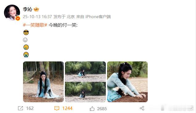 李沁用emoji形容今晚的付一笑《一笑随歌》李沁用emoji形容今晚的付一笑:从潇洒 幸福到担心 最后悲伤大哭[捂嘴哭] 今晚的付一笑到底经历了什么?今晚大家记得去看李沁破碎版付一笑