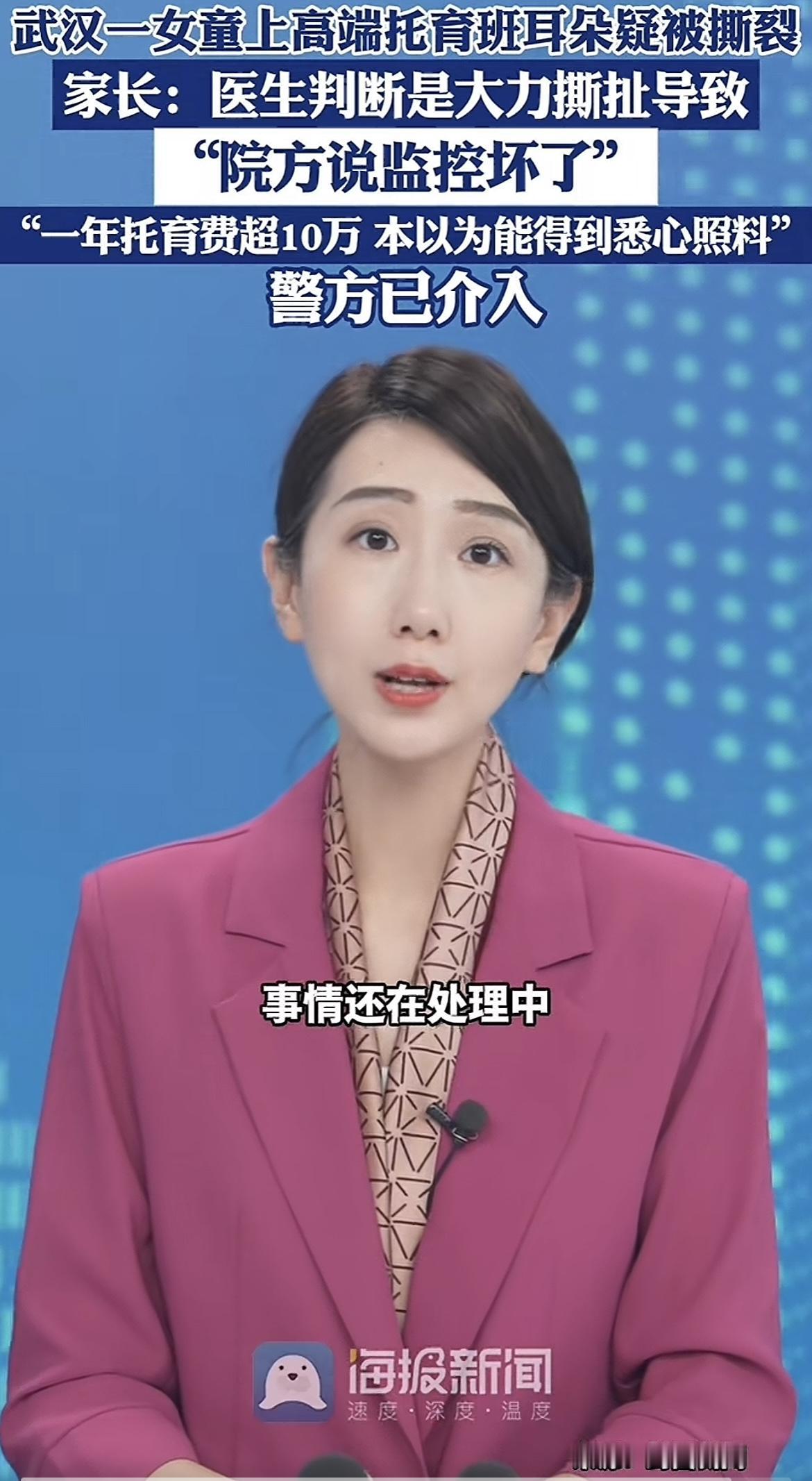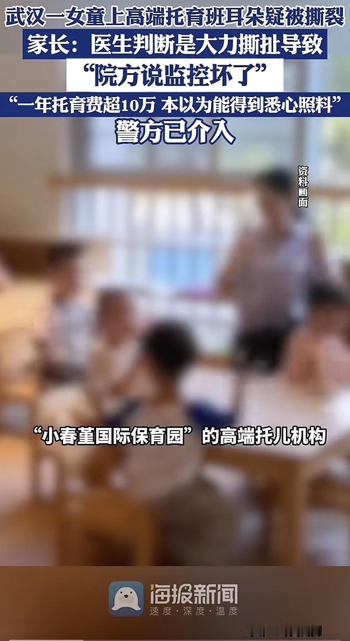 必须严惩!湖北武汉,一女子把孙女送进一家高端托儿所,每年费用10万多,结果9月18日她接到消息,说孩子耳朵受伤了,女子问老师怎么伤的?3个当班老师都说没看见,不知道,怀疑是汗渍渍出的伤口,女子连忙把孙女送去医院,医生否认了老师的说法,认为是大力拉扯导致的撕裂伤,女子让老师出示监控,却被告知监控坏了,接着,老师以女子扰乱秩序为由报了警,看着孙女不敢开口说伤怎么来的,女子更加确认这事儿不简单。 据海报新闻9月29日报道,一名女子为了能够让自己的孙女得到新鲜的照料,就报了一个特别昂贵的托育班,不料女儿并没有得到特殊的照顾,反而还惹了一肚子气。 事情的起因是孙女士(化名)让身体能够得到更好的教育,于是她们就看了很多专业的托育机构,看了很多之后自己是觉得如果报便宜的话老师肯定不会有那些高端一点的对孩子负责。 随后她就报了一个每年最低标准10万元的托育机构,本想着孙女在这里面可以得到高端的教育以及照料,不料那天孙女士正家里面做饭的时候的时候突然接到了老师的电话说她的孙女耳朵受伤了。 挂断电话之后,孙女士就急忙忙的赶紧去了托育机构,到那之后,她看到孙女耳朵上面有一个很大的伤口的时候既心疼又愤怒,就立马询问老师,这到底是怎么回事。 不料这时候三位老师给孙女士解释说,他们当时也并没有看清楚到底发生了什么,而且他们猜测孩子耳朵上面的伤口很有可能是因为刚才在上体能课的时候,由于出汗太多了,所以渍除了伤口。 面对老师这样的说辞孙女士很生气,但是为了孩子的安全警戒,她还是先带孩子去了医院,到医院之后,经过医生的检查之后发现孩子伤口足足有三厘米,并说这样的伤口是因为经过大力的撕扯之后才导致的。 听到这之后孙女士很是生气,随后的孩子的情况好了一些之后孙女士就又去了托育机构要求盗取刚才上体能课的监控录像,查看到底是怎么回事,不料这时候院方却说监控刚好前几天的时候坏了,所以根本没有办法检查。 面对这样的说辞,双方争议不断,最后选择了报警处理这件事情,目前这件事情还在进一步的处理中。 很多网友看到了这件事情之后,有一些网友在下面评论说,面对这样的事情,一定不能松口,一定要严查到底。 还有一些网友说,不管怎么样,孩子终究是自己带着最放心,所以对于孩子的事情,家长也一定要操心,不要将所有的事情都交给托育机构。 那么通过这件事情也告诉我们,一个教育机构如果想要发展成就的话,一定要对孩子的身体健康负责,不然的话只打着“贵”的名义是干不长久的。 那么,对此你还有什么看法呢?