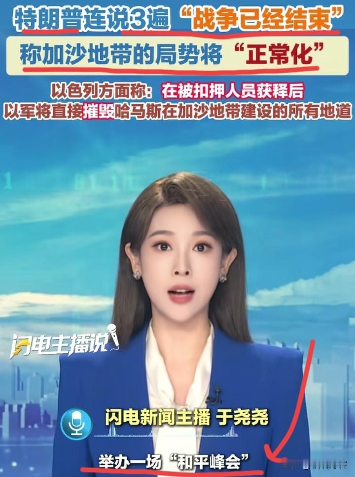 就该早点结束, 再打下去,对双方都没有好处,费钱费力矛盾越来越多。川普多次诉说:战争已结束,加沙局面将走向“正常化”。 还有开这个“和平峰会”,希望真是要结束战争啊,大家能不累吗这场战争打了多久,就有多让人心惊胆战。虽然停火协议签订了,但谁知道后面有没有可能再次被撕毁。