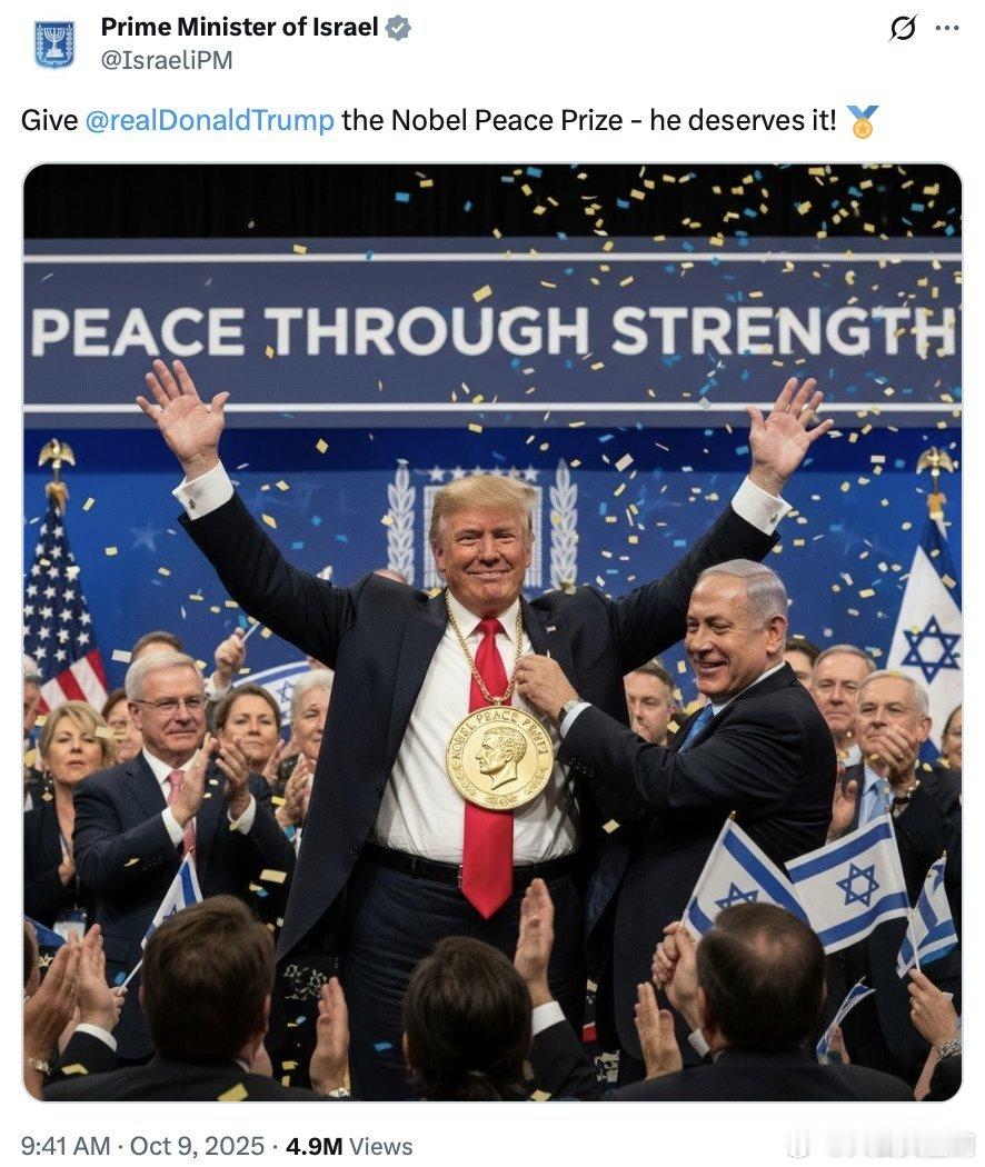 特朗普社交媒体上转发内塔尼亚胡发布的AI图:“给特朗普颁发和平奖”。(来源:大公文匯網)
