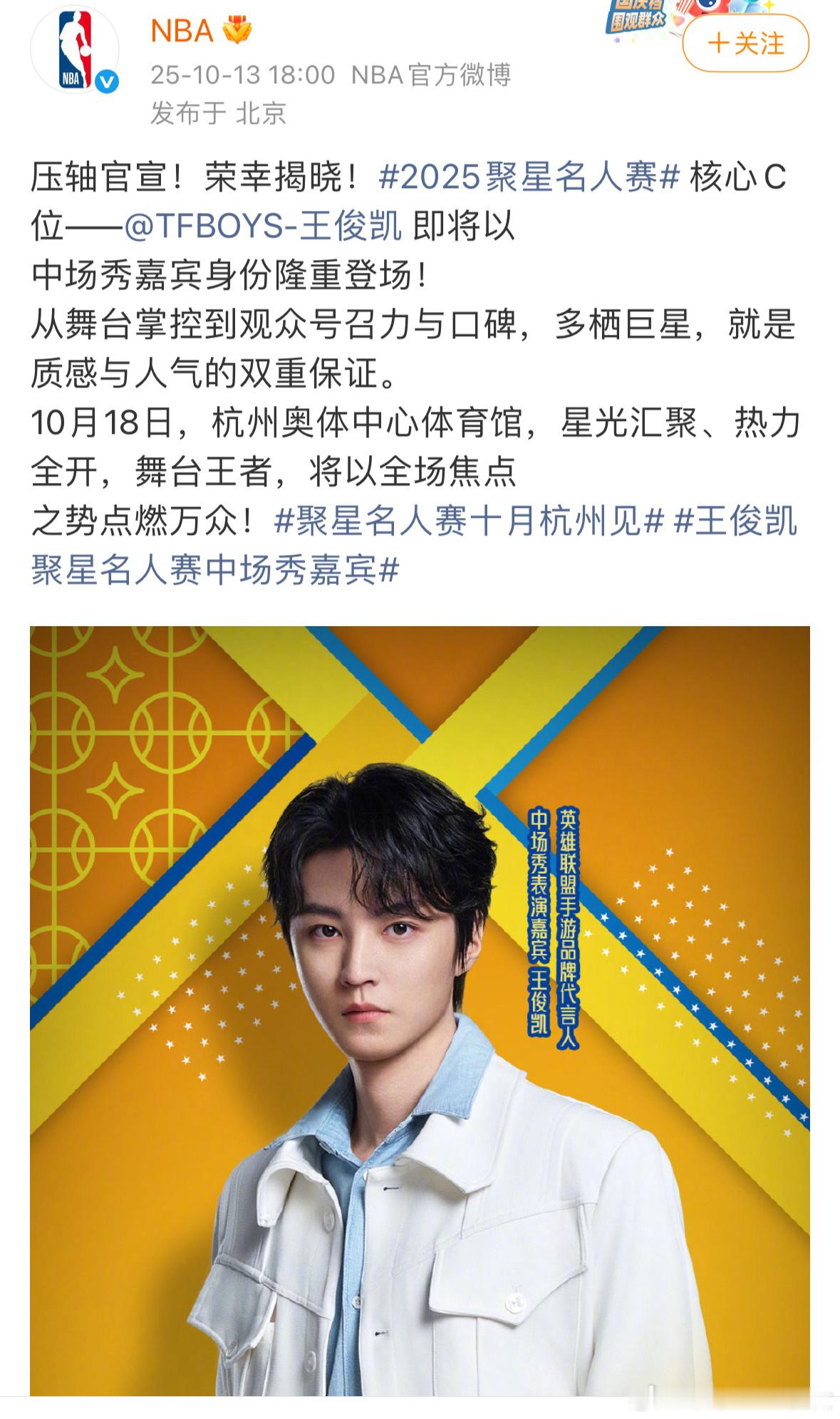 王俊凯核心C位➕压轴,中场秀嘉宾,NBA官方发的。NBA海报吵了几天C位,替人尴