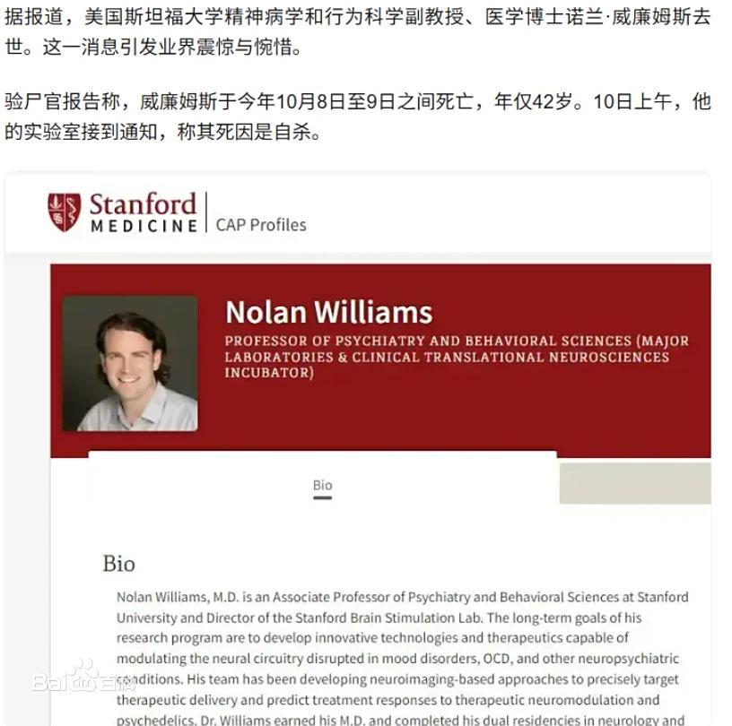 医者不能自医! 近日,精神病学界传来一则令人惋惜的消息,一位年仅42岁的抑郁症研究的教授去世。 他叫诺兰·威廉姆斯,美国知名精神病学研究专家,威廉姆斯教授出生于1983年,毕业于美国斯坦福大学。他常年致力于研究抑郁症、强迫症和其他精神疾病,他带领着他们的团队取得了很多成就和突破。让他们逐渐成为业界的翘楚。 但是在这一光环背后,威廉姆斯教授身上背负的压力也是巨大的,俗话说得好,希望越大,失望越大。当他们的研究越来越深入,他们发现事情远远没有他们想的那么简单,精神类疾病的治疗向来都是全世界的医学难题,他们便陷入深深的自我怀疑之中。 再加上长时间和精神类病人待在一起,难免抑郁和心理出现问题。 抑郁症治疗的先驱,威廉姆斯教授救了无数人,但是最终却无法救治自己,医者不自医,太痛心了!