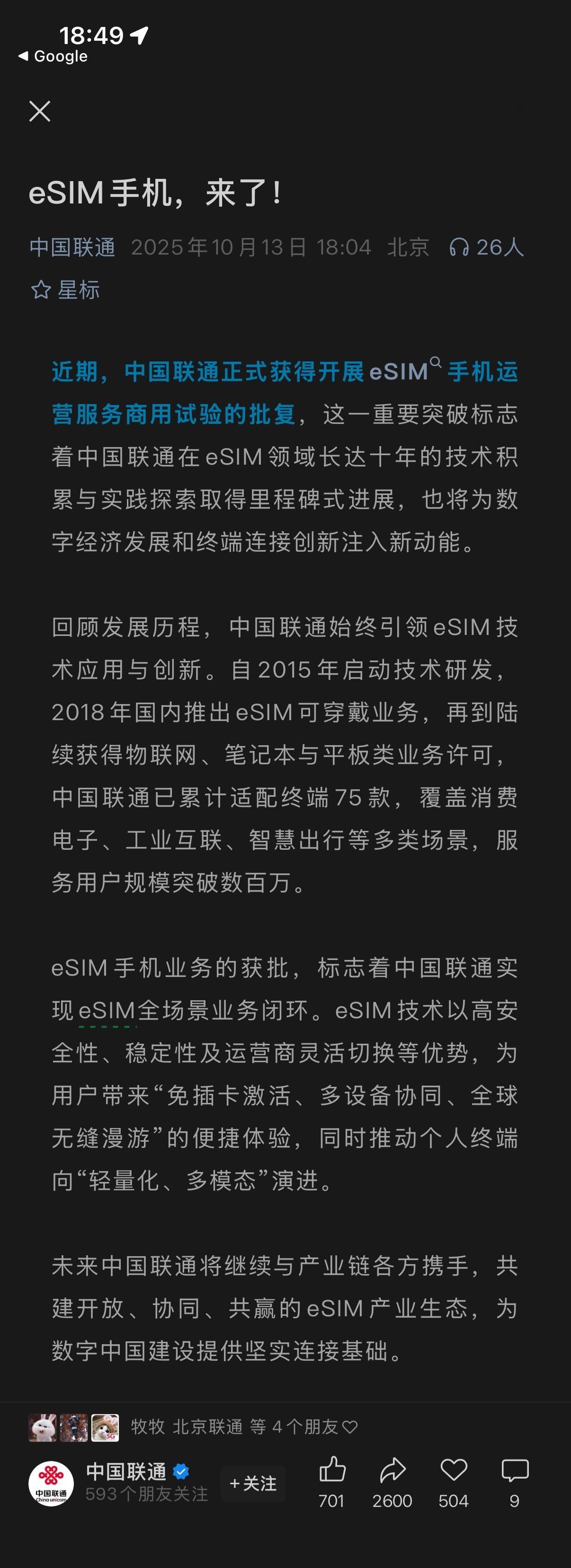 中国联通官宣了 eSIM 手机要来了[good]坐等国行 iPhone Air