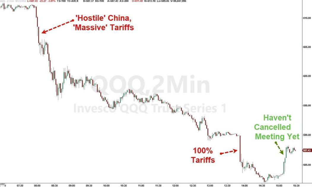 不得不说华尔街这帮资本家真是把特朗普的套路摸得透透的!美东时间周五先是上演“黑色星期五”,道指跌1.9%,标普砸2.71%,纳指直接暴跌3.56%,创下4月以来最惨单日跌幅,ARM跌超9%,高通、超威半导体暴跌。可刚刚过去一天盘后就直线反弹,明眼人一看就懂——特朗普喊的“对华加税100%”纯属诈唬,根本没法真干! 股市这波先跌后涨的戏码,说白了就是跟着特朗普的嘴在走。他一喊加税,投资者先慌了神,赶紧抛股票避险。你想啊,高通、ARM这些半导体公司,好多芯片都要卖到中国,真加100%关税,要么中国这边买得少了,要么他们得自己扛成本,利润肯定受影响,股价能不跌吗? 而且不光是科技公司,美国好多行业的供应链都跟中国连着,加税就像在产业链上砍一刀,上游成本涨了,下游商品也得贵,企业赚钱难,股市自然跟着跌。 但华尔街的人精们很快就反应过来:这事儿成不了。之前几次加税的教训还摆在那儿呢,加税最后买单的都是美国老百姓。就说去年,对巴西咖啡加了50%关税,没多久咖啡价格就涨了4%,创了14年最大涨幅;对墨西哥西红柿加税,美国超市里的西红柿也跟着涨价。 现在要是真加100%,那日常用品价格不得翻倍?本来美国通胀刚稳住点,这么一搞肯定又炸了,老百姓日子不好过,肯定得骂特朗普,他可不敢冒这个险。而且美国企业也扛不住,之前约翰迪尔公司因为钢铁关税就赔了3亿美元,现在再加税,更多企业得亏损,到时候企业老板们也得站出来反对。 更有意思的是,特朗普自己留了条后路,把加税生效时间定在11月1日,这明摆着就是给谈判留空间呢。他心里清楚,真要实施了,中国肯定会反制。之前中国刚对稀土产业链搞了出口管制,稀土可是美国军工、芯片产业的关键材料,这一招已经戳到特朗普的痛处了。要是真激化矛盾,中国还有更多反制的办法,美国企业损失只会更大,所以这关税威胁更像是虚张声势,等着对方让步呢。 特朗普这么着急放狠话,根本不是为了什么国家利益,就是自家的麻烦实在压不住了,想转移注意力。现在美国政府从10月1号就停摆了,近300万联邦雇员里,80万人得无薪休假,连自由女神像的运维都成了问题。停摆的原因就是两党为了医保补贴吵翻了,共和党要砍补贴,民主党不让,谁也不让步,最后把政府搞停了。 特朗普自己的民调也跌到谷底,支持率才41%,认可他处理经济和生活成本问题的人更是只有28%,大家都觉得美国经济在走下坡路。国内一堆烂摊子解决不了,他就只能拿中国当靶子,喊几句狠话显得自己很强硬,让选民别盯着他的执政烂摊子看。 特朗普这招转移矛盾的套路早就用过好几次了。之前政府停摆、民调下滑的时候,他就喜欢拿贸易说事,靠对外强硬稳住自己的支持者。 这次更明显,政府停摆着,他不光喊加税,还想借着停摆裁掉一些不支持自己的联邦雇员,顺便砍掉民主党的项目资金,把党争的锅也甩出去。可华尔街早就把他摸透了,知道他这些威胁都是政治表演,根本不会真落地,所以恐慌情绪一过,资金立马回流股市,股价自然就反弹了。 其实大家心里都清楚,现在中美产业链绑得这么紧,真打贸易战没有赢家。美国半导体产业高度依赖国际分工,离了中国市场和供应链,自己的竞争力也会下降。特朗普喊加税100%,就像小孩子吵架放狠话,看着凶,其实根本不敢真动手。华尔街的资本家们更是门儿清,所以才敢在跌了之后立马抄底,赚这波情绪差的钱。 说到底,这就是一场特朗普自导自演的政治秀,可惜观众早就看腻了他的套路。