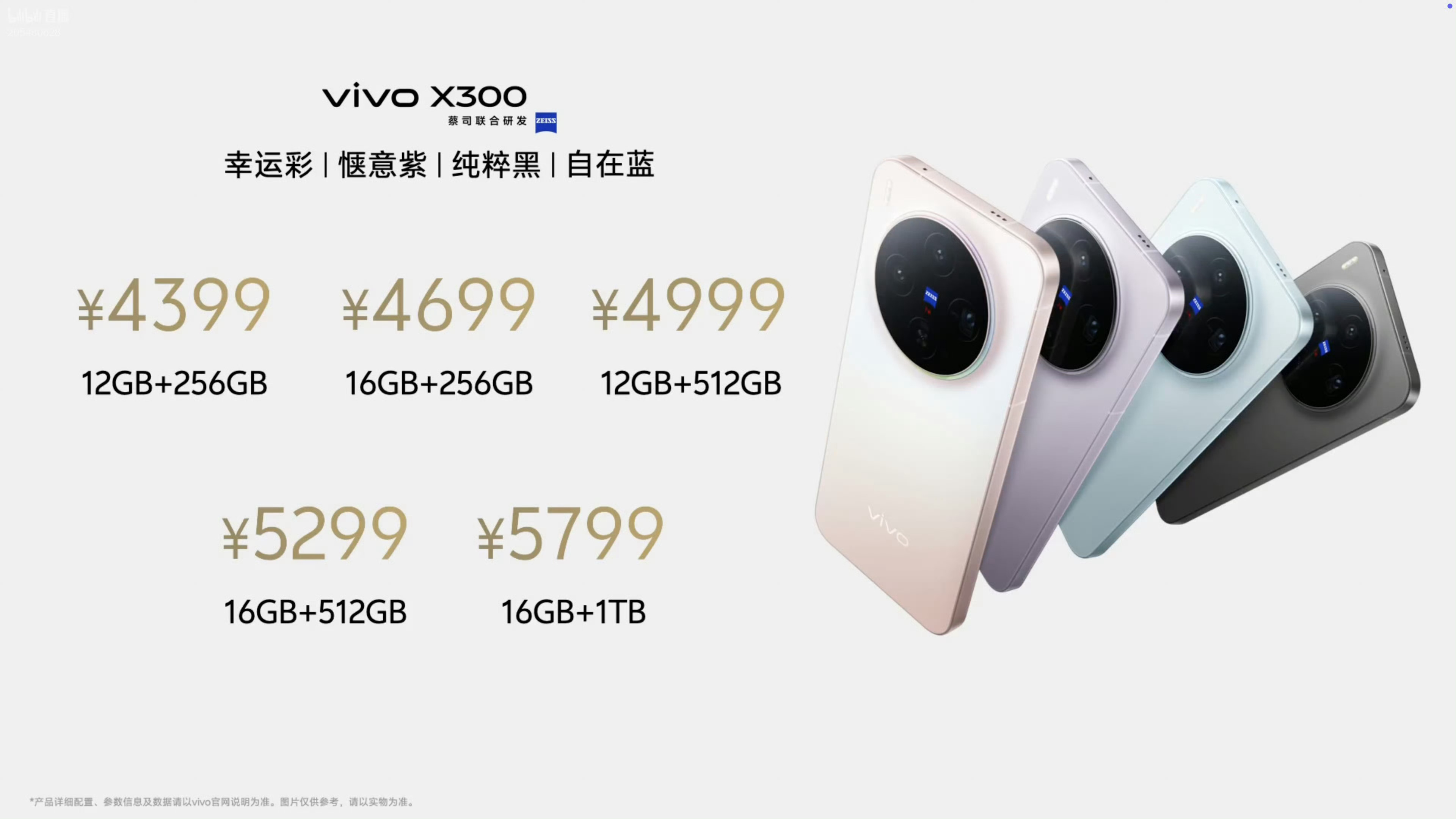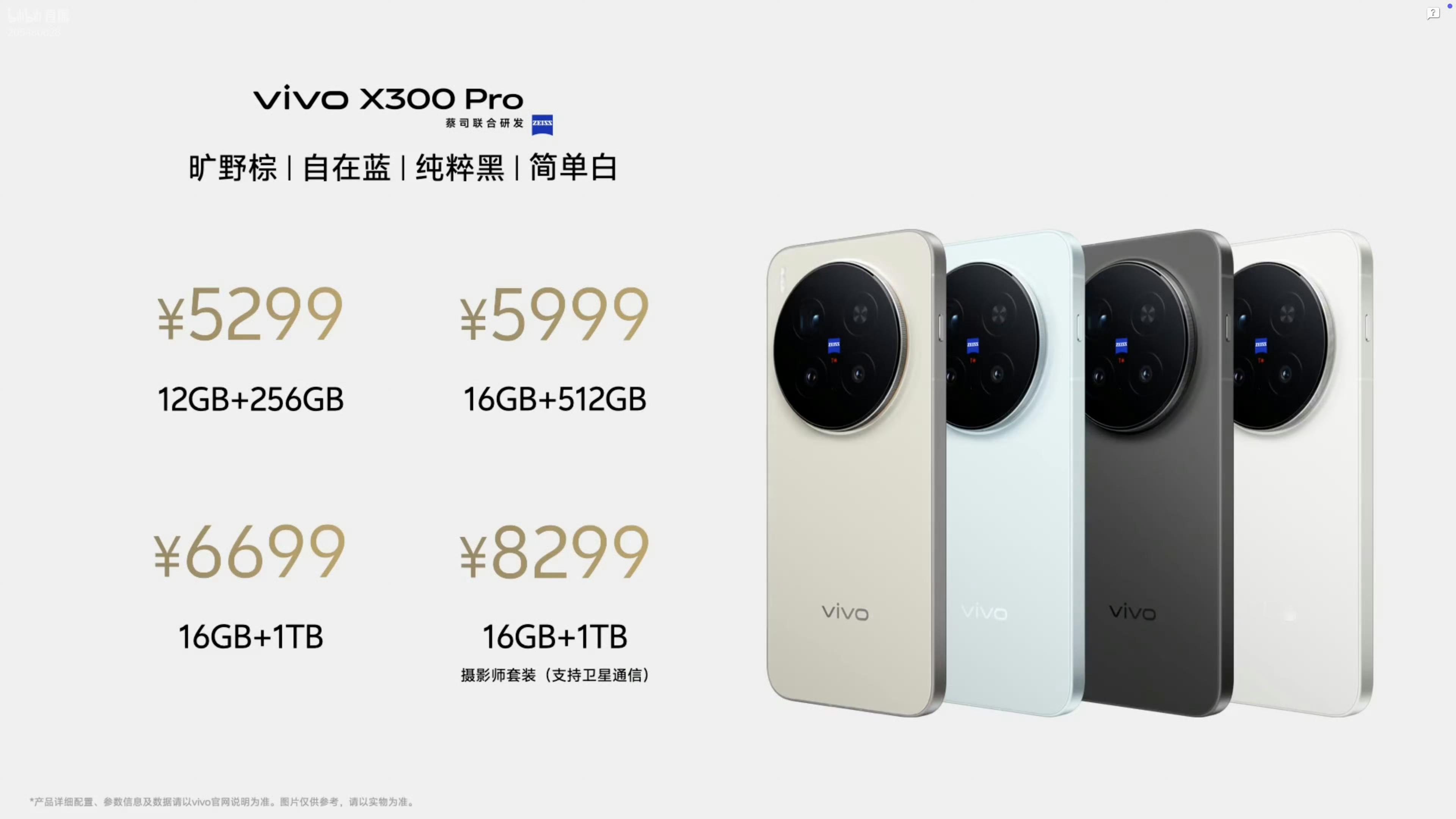vivoX300系列发布会 vivo X300 系列价格公布,标准版4399起,Pro版本5299起,16+1TB 摄影师套装(卫星通信)8299元。