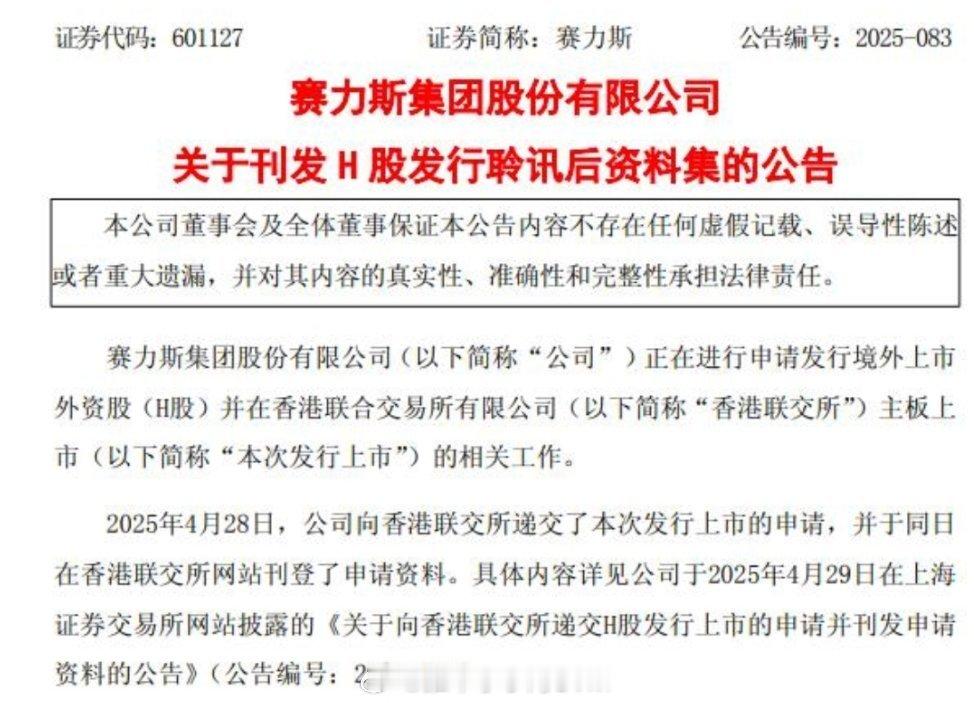赛力斯将成首家“A+H”两地上市的豪华新能源车企。