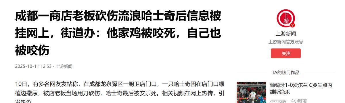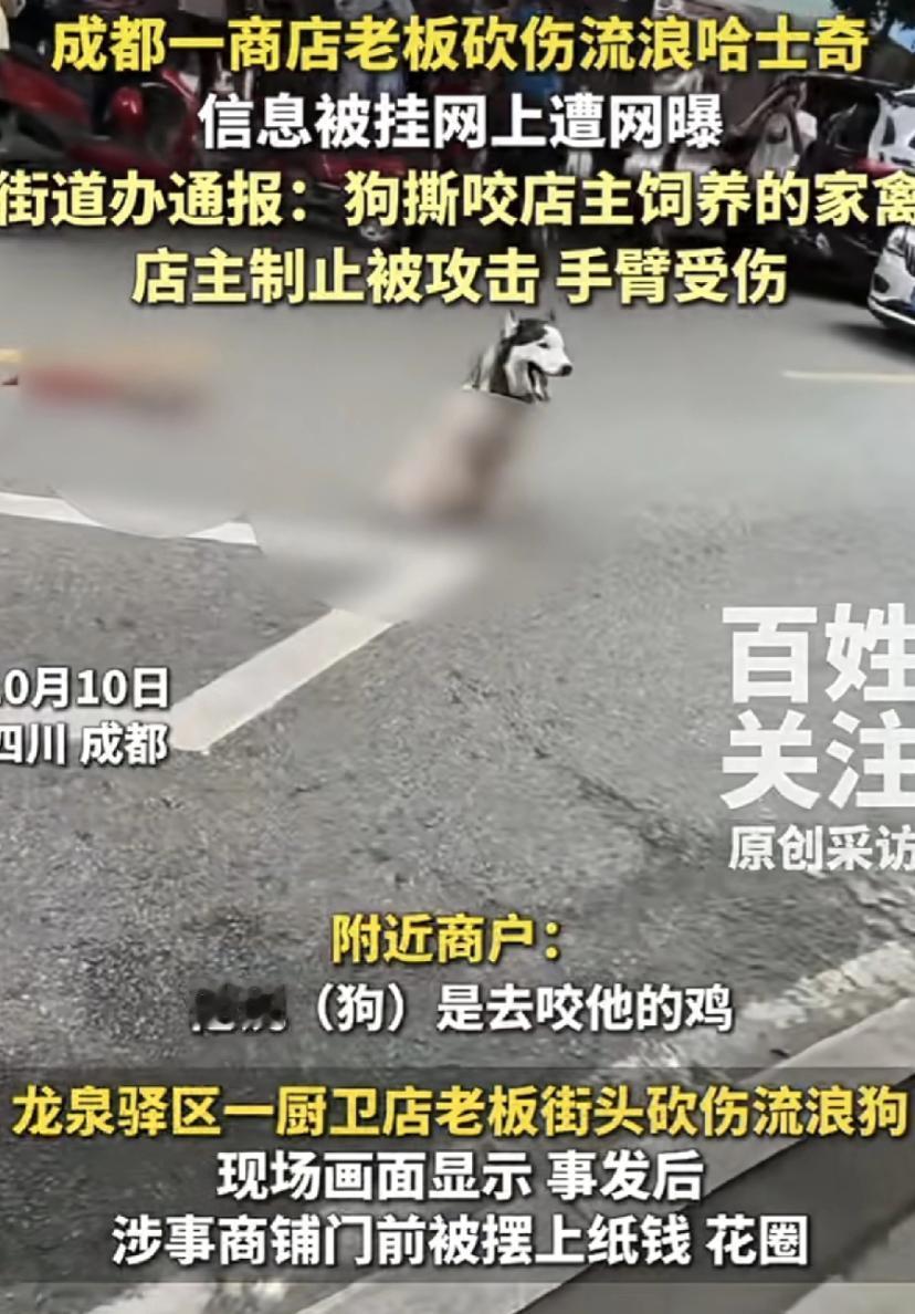 网传,四川成都,一只流浪哈士奇因在在某店家门口绿植撒尿后,被店老板当场用刀砍伤,最后哈士奇因伤势太重被安乐死。因此店主个人信息被挂网上,还遭到一些人为其送花圈,但官方最新通报却反转了。通报称,店主之所以砍狗,是因为此狗不但咬死店主家养的鸡,店主在阻止它时还被其咬伤了手,所以店主一气之下才砍伤了狗。 前阵子刷到成都那事儿,真是一波三折,刚开始看网传视频的时候,我都跟着气炸了,网传消息说10 月 10 号下午,四川成都龙泉驿区翠竹路那边,一只流浪哈士奇跑到一家店门口的绿植边上撒了泡尿,结果店主直接拿着刀冲出来,对着狗就砍了过去。 视频里能看到狗被砍后在地上哀嚎,看着特别可怜,底下评论区瞬间就炸了锅,大家都骂店主太残忍,不就是动物撒个尿吗,至于下这么狠的手,下手也太狠了。 没一会儿更让人揪心的事儿来了,不知道是谁把店主的个人信息、店铺地址还有电话全扒了出来,公开发到了网上,紧接着就有人开始打电话骂他,甚至还有人直接跑到店门口,摆上了花圈和纸钱,闹得特别难看。 周边商户说,事发第二天店铺都没开门,店主电话也关了机,估计是被这阵仗折腾得够呛,那时候网上几乎是一边倒的谴责,都说店主冷血一点爱心都没有,不少爱狗的网友更是气得不行,把这事儿当成了虐待动物的典型案例。 可这事儿没两天就反转了,官方通报一出,大家才知道之前看的视频根本不全,漏了最关键的前因,西河街道办后来发了通报,说那只哈士奇确实是流浪狗,大概 4 天前才跑到这条街上,身上还戴着项圈,但没找到主人信息,周边商户之前还喂过它几次。 但它可不是第一次惹麻烦了,当天下午先是闯进店主店里,把店主养的鸡给咬死了,店主出来赶它的时候,它直接扑上去咬伤了店主的左手手臂,店主又疼又气一时没控制住,才拿刀砍伤了狗。 这两个被截掉的细节一出来,网上的说法立马就分裂了,有人觉得店主没做错,毕竟自己的鸡没了,手还被咬伤换谁都得急,这根本不是虐待动物,是处理威胁自身安全和财产的危险源。 但另一拨人还是觉得,就算狗有错拿刀砍也太极端了,超出了合理的范围,毕竟生命都是平等的,不过比起线上吵架,更让人不适的是那些线下骚扰的行为。 就算一开始不知道真相,跑去骂两句也就算了,摆花圈这种事儿,明显已经越界了,看着都让人觉得膈应,后来律师也说了,不管是店主还是这些闹事的网友,其实都踩了法律的边界。 官方的处理倒挺冷静的,一边把受伤的狗送去宠物医院,一边陪着被咬伤的店主去打狂犬疫苗,工作人员还贴了寻主启事,可一直没人来认领,可惜那只哈士奇伤得太重最后没救活,只能让农业农村部门委托机构做了人道安乐死,算是给这事儿画上了句号。 现在再回头看这事儿,真是挺让人唏嘘的。要是一开始的视频能把前因后果都拍全,估计也不会闹这么大动静,好多人都是看了个片段就急着站队,结果被碎片化的信息带着走,甚至做出了送花圈这种过激的事儿。 其实店主被咬了手、丢了鸡,心里肯定窝火,可拿刀砍确实不够理智;狗虽然闯了祸,但也是条生命,最后落得这样的下场也让人惋惜。 更该琢磨的是城市里的流浪动物到底该怎么管。总不能等出了事儿,大家才吵来吵去,要是能有更完善的管理制度,说不定就能避免这种悲剧。 (信息来源:上游新闻——成都一商店老板砍伤流浪哈士奇后信息被挂网上,街道办:他家鸡被咬死,自己也被咬伤)