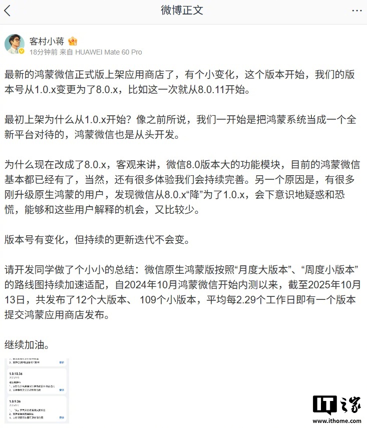 [微信员工回应鸿蒙版本号从1.0.x变更为了8.0.x:微信8.0版本大的功能模块,鸿蒙微信基本都有]10月13日晚,微信8.0.11.34forHarmonyOS发布,版本号从1.0.x跳到8.0.x。微信员工回应,一是功能已基本看齐8.0版,二是避免用户疑惑。##微信鸿蒙版本号变更##