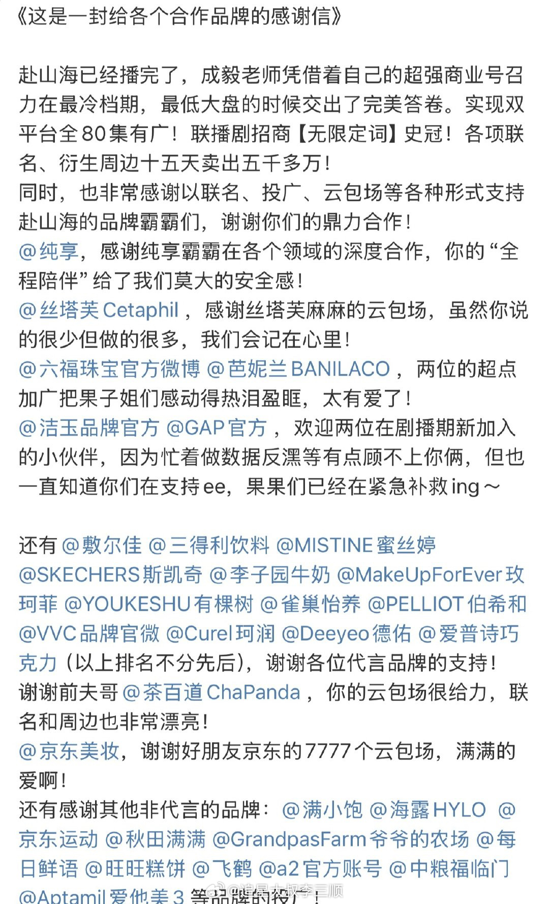 成毅粉丝给赴山海合作的品牌方发了感谢信,芭妮兰回复会二次合作给王权投放[送花花]