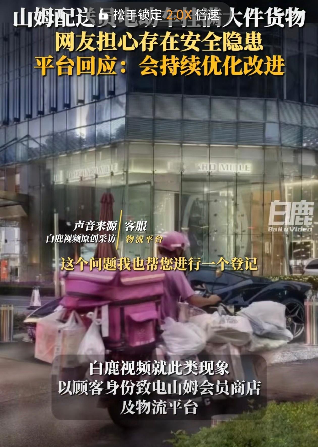 现在就业困难,配送员也是没有办法的办法,解决问题还应该是山姆出手,山姆你可以给配送员配备一个小车,这样一方面可以拉下更多东西,一方面也可以保证安全。