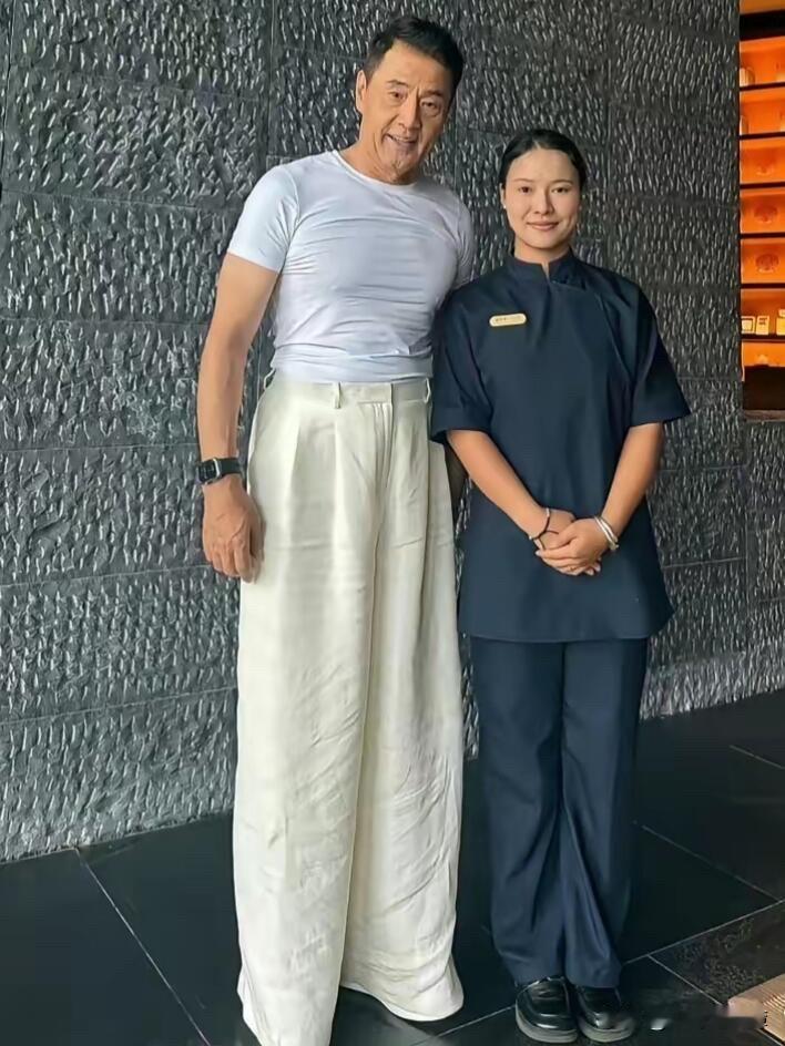 67岁于荣光胸肌藏不住~~近日,有网友在云南普洱偶遇67岁的于荣光,简单白T恤下