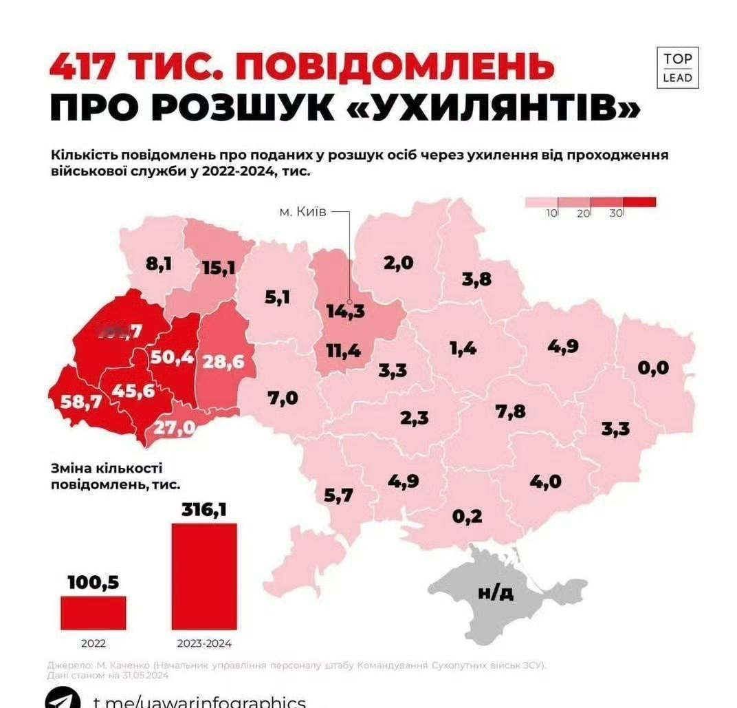 2022-2024,乌克兰各地区逃兵数据统计(法办) 单位:千 比较搞笑,最最具爱国精神和元首指导思想的西乌克兰,逃兵最多。最低的都有2万7。 整个西部地区2年时间逃兵25万多。。。。 “荣耀属于乌克兰,荣耀属于国父班德拉,离前线越远,荣耀属于西乌克兰就越多!”