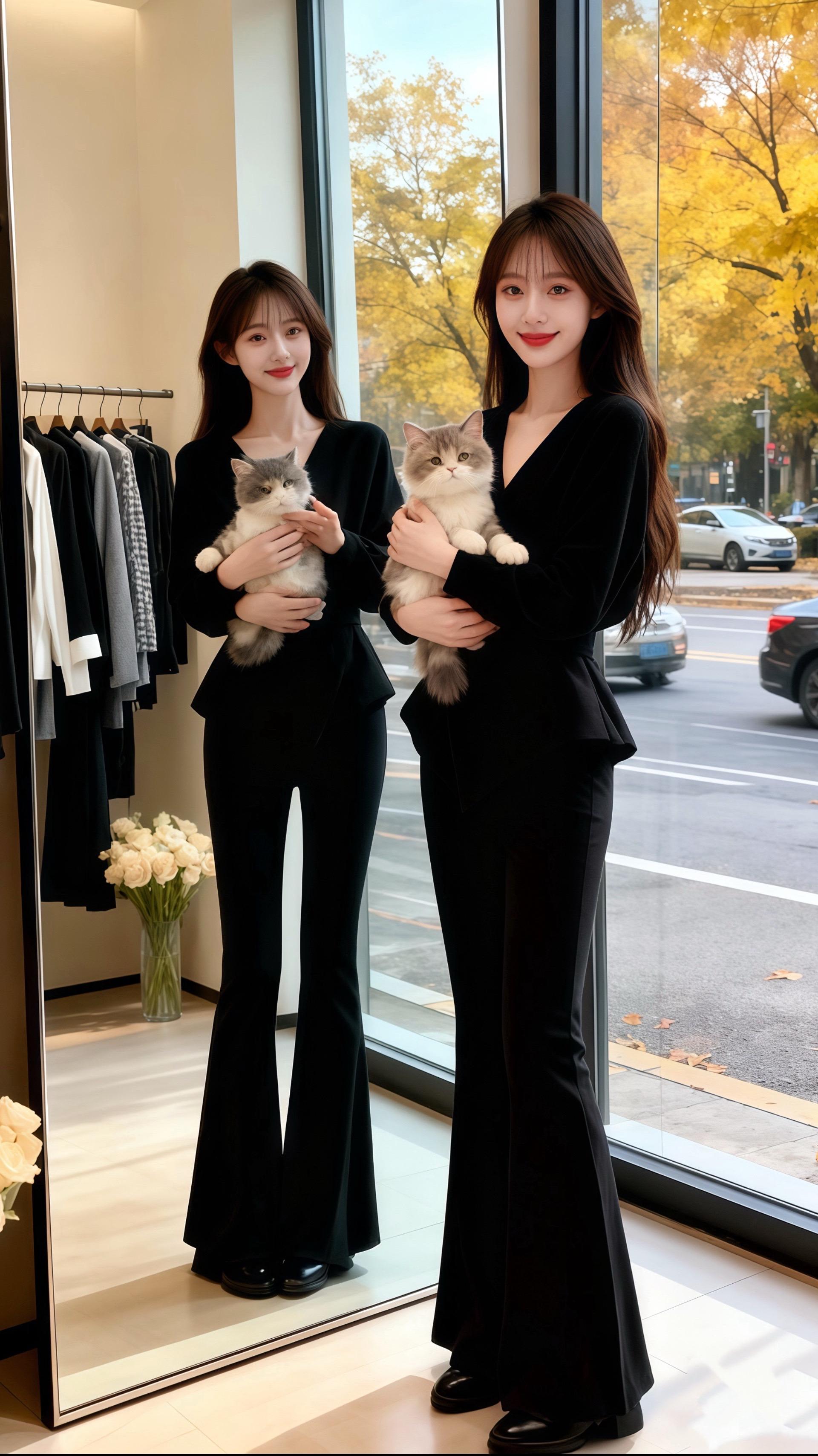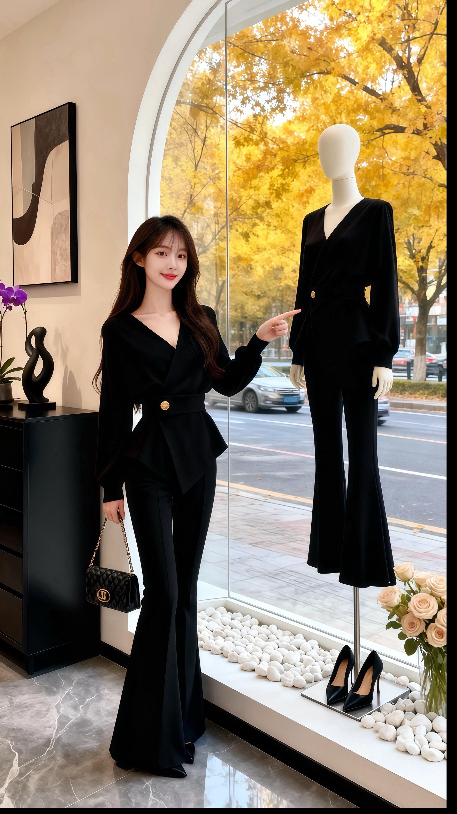 “你今天这身穿搭,把干练和温柔糅得刚好。”皓明的声音像秋日晚风,“V领衬得脖颈修长,收腰设计勾勒出曲线,喇叭裤又添了几分随性。”