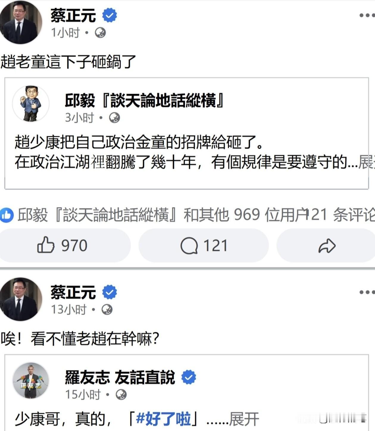 赵少康这次真的惹众怒了。 蔡正元在自己的账号发视频与文章追着批评赵少康。邱毅也当仁不让连续发文谴责赵少康。郭正亮在中天的节目中更是直白表示不懂就不要乱说,批评赵少康根本不懂网络生态。另外,赖岳谦、陈凤馨都相继在赵少康的节目中直接反驳赵少康认为有“境外网军介入”的观点,而陈凤馨还是在赵少康主持节目时不点名的说他这种观点非常浅薄。 要知道这些都是评论员,赵少康除了是国民党员之外更是媒体人,平时还是“战情室”节目的长期主持人,这次被这么多评论员公开质疑,不仅让他名声扫地,也让他以后主持节目的公信力大幅下降。不得不说,这次赵少康为了郝龙斌的选举,真的用力过度了,无形中为他自己挖了一个难以弥补的大坑。