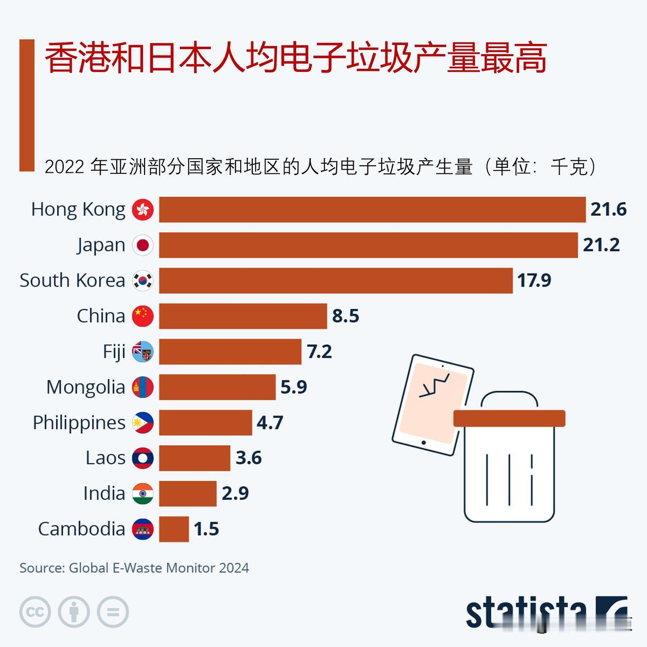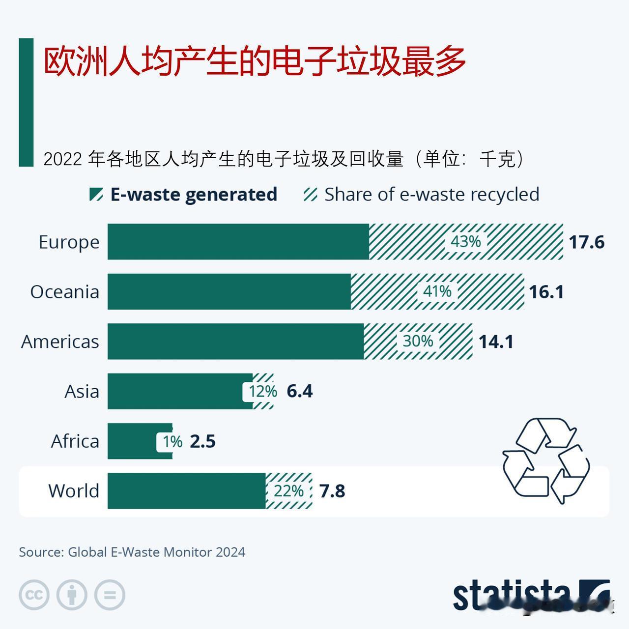 全球电子垃圾知多少,哪里产生的电子垃圾最多? 每年的 10 月 14 日是国际电子垃圾日,这一活动于 2018 年设立,旨在提高人们对日益严重的电子垃圾问题的认识,并推动其回收利用。电子垃圾在全球范围内正成为一个日益严重的问题:自 2010 年以来,全球产生的电子垃圾总量平均每年增加 23 亿千克。 全球范围内,每个人每年平均会产生约 8 千克的电子垃圾。然而,世界不同地区之间存在显著差异,根据最新的《全球电子垃圾监测报告》显示:2022年欧洲以每人约 17 千克的电子垃圾量位居榜首,而非洲每人仅产生 2.5 千克。与此同时,欧洲的回收率最高,达到 43%。亚洲和非洲需要进行更多的改进,其电子垃圾回收率分别为 12%和 1%。 如下面图表所示,亚洲各地人均产生的电子垃圾数量差异很大。2022 年,柬埔寨人均产生了约 25 千吨电子垃圾,相当于每人产生 1.5 千克的垃圾;而香港则产生了约 161 千吨,即人均约 22 千克,这使得香港成为亚洲人均电子垃圾产生量最大的地区之一。同年,日本人均产生的电子垃圾约为 21.2 千克。 根据《全球电子垃圾监测报告》的最新数据,2022 年全球产生的电子垃圾达 620 亿千克,而其中仅有 22.3%的垃圾得到了正式的收集和回收处理。其余的电子垃圾则是未经官方处理而被私下收集、部分回收、作为残余废物处理并被送至垃圾填埋场。不同地区的官方与非官方收集及回收统计数据之间的差距差异很大。