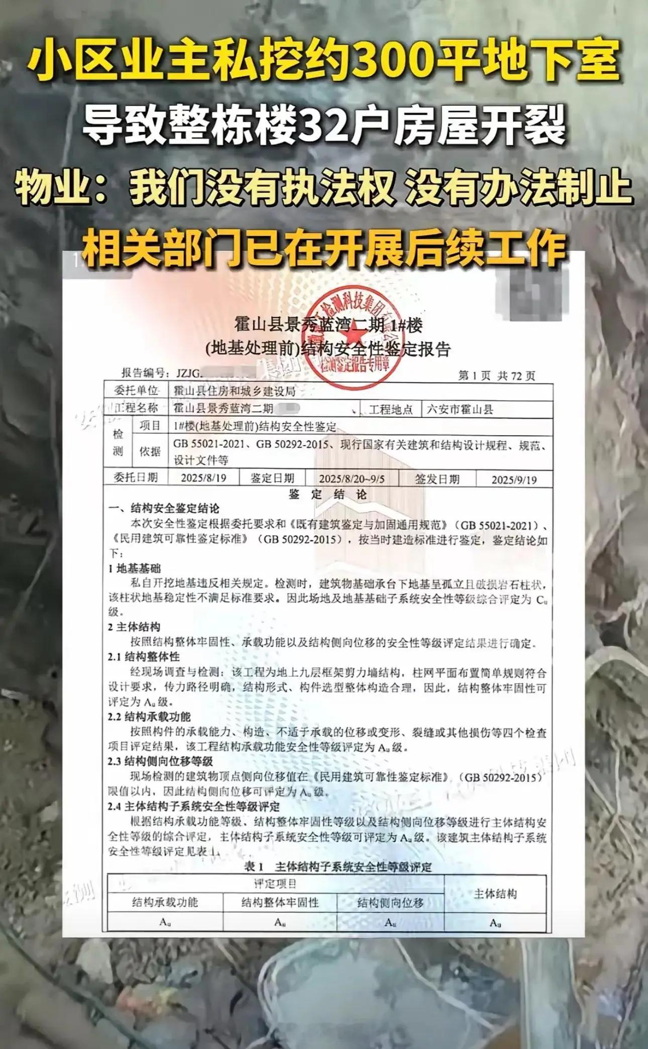 业主私挖300平地下室32户开裂 物业称没有执法权无法制止。等着吧,业主、物业、施工方,一个都跑不掉,够吃一壶的。业主说到底是个体,他能赔多少钱?赔不了只能坐牢。而没有起到监督的相关部门、物业,以及肆意妄为的施工方,恐怕赔大头,说不定也得吃牢饭![无聊]