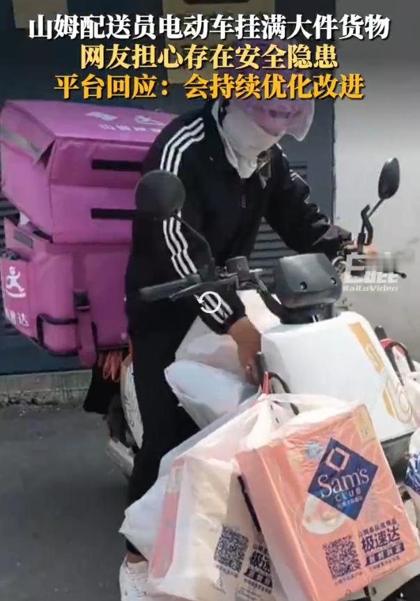 山姆配送员电动车挂满大件货物这事儿不能就这么算了呀!山姆和第三方物流平台得尽快行