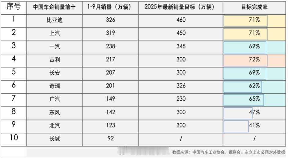 亚迪与上汽集团1-9 月累计销量均突破 300 万辆。比亚迪326万辆,完成了460万辆目标的71%,这么来看全年完成目标的问题不大。上汽集团 319万辆,也是完成了71%。完成率最高的是吉利集团的72%,完成了217万辆。