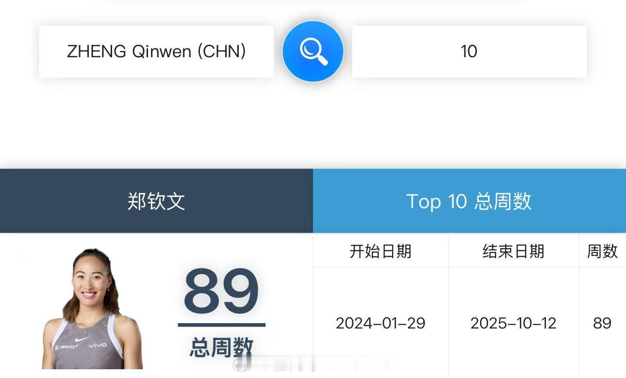 郑钦文本周世界排名跌至第11位,她在2024年1月29号开始的世界前十周数累计达89周。