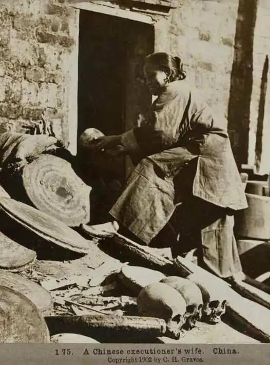 这张拍摄于1902年秋北京的照片,在正午阳光的映照下,呈现出一段极具时代烙印的特殊谋生图景。画面里,一名妇人在门前的地面上,将三枚无下颌的头骨整齐排列,白森森的骨面在阳光下泛着冷光,她却神态平和,仿佛眼前不是骸骨,而是待晒的衣物、待晾的粮食。 这一幕被旅居北京的外国摄影师偶然捕捉,追问后才揭开背后的史实:妇人是京城劊子手的妻子。清末死刑仍以斩首为主要方式,按《大清律例》,无人认领的死囚首级本需交由官府处置,但在乱世中,这条规矩逐渐松动。而 1902 年的北京,随着西医教育的初步发展(如1901年京师大学堂增设医学馆,1903年北洋军医学堂正式办学),解剖教具成为稀缺品;同时,新式画馆为精进人体结构绘画,也需真实骨骼参考;甚至民间拳师为研究人体要害,也会寻觅洁净骸骨 —— 多重需求下,“处理净骨” 成了刽子手家庭的隐秘生计。