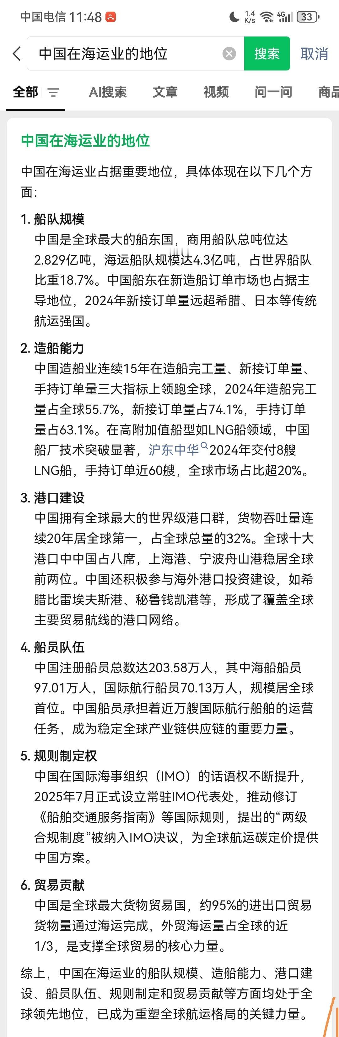 太强了!我仔细阅读了交通运输部在10月14日发布的《对美船舶收取船舶特别港务费实施办法》之后,发现这简直就是对美国航运业、美国外贸业的一个降维打击。 首先我们需要知道的是,我国是全球海运行业当之无愧的霸主,在全球前百大港口中,我们占有24席,全球前十大港口中,我们更是占有6席,我们的海运船队、港口规模,全都是世界第一,国际海运量占全球的1/3! 而且,更加重要的是,我们经济一直在不断发展,与东南亚、拉丁美洲、非洲等全球各大新兴市场的进出口贸易也变得更加旺盛,因此未来我国的海运行业只会更加繁荣,潜力十足。 除此之外,我们的造船业也是当之无愧的全球巨头,基本上全球主要航运公司都是靠我们的造船厂建造新船,比如说全球最大航运企业瑞士地中海航运公司,其92%的新船订单都在中国! 与此形成鲜明对比的是美国,美国的造船业现在已经彻底衰落,但是美国95%以上的外贸货物运输都是依赖海运,因此现在美国都是依赖非美国的国际航运公司进行货物运输,它自己是没有什么船只,也没有什么航运公司的。 这就导致了一个很多人都意想不到的结果,那就是:我们在海运业的话语权,其实比美国大得多! 而现在最新颁布的《对美船舶收取船舶特别港务费实施办法》当中,我们规定,对“美国的企业、其他组织和个人拥有船舶所有权的船舶;美国的企业、其他组织和个人运营的船舶;美国的企业、其他组织和个人直接或间接持有25%及以上股权(表决权、董事会席位)的企业、其他组织拥有或运营的船舶;悬挂美国旗的船舶;在美国建造的船舶”,全都要征收船舶特别港务费。 当然,这些船舶中,如果当中有中国建造的船舶,就可以免于缴纳。 由于我们在全球造船业、海运业的巨大话语权,当我们施行这个规则之后,产生的最直接后果就是,全球其他国家所有的造船公司、航运公司,都会选择悄悄与美国拉远距离;美国自身本就仅剩不多的造船业、航运公司,则会因此受到巨大打击,变得更加衰弱。 毕竟,维系这个世界最根本的一个法则,就是实打实的利益,我们的国际海运量占全球的1/3且潜力巨大,只要是有点商业头脑的国际航运公司,用不着多想什么,都会把重点放在经营与我们有关的航线上。 比如说丹麦马士基航运公司、瑞士地中海航运公司等国际航运巨头,现在就已经开始放弃北美航线,转而将重点放在与中国有关的新兴市场的航线上。 而没有了这些国际航运公司的助力,美国自身航运业又非常拉胯,导致的一个负面结果就是,与美国有关的诸多海运航线,收费将进一步提高,再加上美国本身的高关税,运往美国的商品,价格就会因此变得更高,商品数量也因此变得更少,从而加剧美国国内的通货膨胀,让美国普通民众生活变得更加糟糕。 美国以为可以在造船业、航运业拿捏我们,可实际上冷冰冰的现实却是,它在造船业、航运业上,与我们相比,根本没有任何竞争力,我们出台的《对美船舶收取船舶特别港务费实施办法》,直接就能对美国造船业、航运业,形成降维打击!