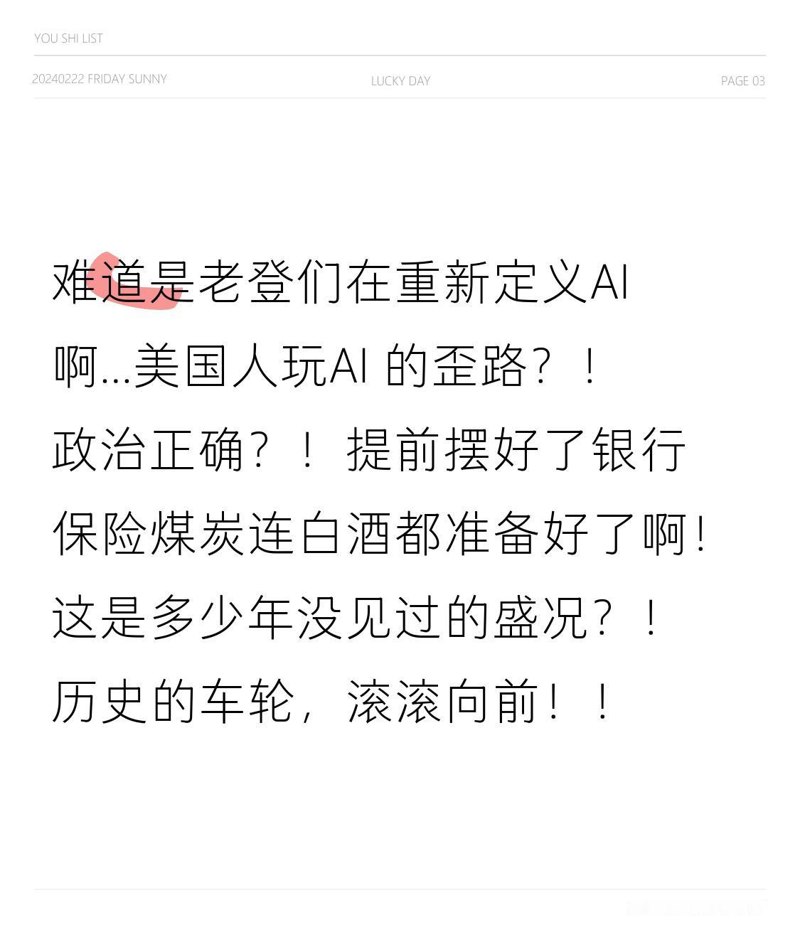 难道是老登们在重新定义AI 啊… 美国人玩AI 的歪路?! 政治正确?! 提前摆好了银行保险煤炭 连白酒都准备好了啊! 这是多少年没见过的盛况?! 历史的车轮,滚滚向前!!