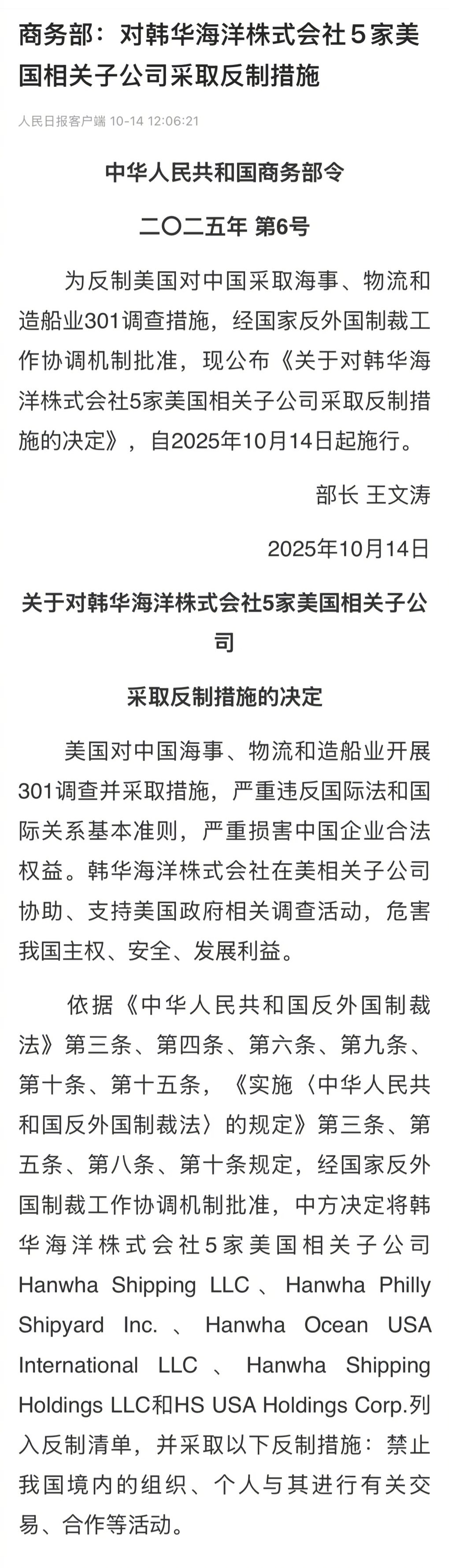 中国对韩华海洋株式会社5家美国相关子公司采取反制措施