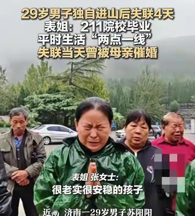 苏阳阳的遗体已经被找到,10月13日下午消息传出,山东济南29岁失联的苏阳阳遗体在玉函山被找到。 知情人透露,他是在悬崖底找到了,找到他的时候,旁边还有他的鞋子和折断的树枝。 他的手里紧握着手机,可惜手机没有电了。 看样子,他想着曾经试图求救。 看着手上紧握的手机,那说明他不是自杀,而且不小心滑下了山崖。 这些日子,济南都是下雨,除了下雨还有大雾天气。 下雨,会把上山的路淋湿打滑。 下雨天气,这湿滑泞泥的山路,和能见度很低的环境,让本来就险峻的玉函山更加凶险。 这样的天气,这样的环境,让本来心情不好的苏阳阳,不小心滑到了悬崖下。 苏阳阳是10月4日独自一个人去济南玉函山。 10月4日下午的时候,他还和同事正常开视频会议,安排工作。 可是,开了视频会议后 ,他就失联了。 也可能,下午的时候,他就出事了。 下雨大雾的济南玉函山,谁会在这样子的天气去爬山游玩呢? 苏阳阳如果不是母亲催婚,这样子的天气,他也不会雨中爬玉函山。 苏阳阳的亲属说 ,他是名牌211大学毕业,身高185,毕业后就找到了一个不错的工作。 虽然29岁了,但他有稳定的工作,情绪也比较成熟。 他的妈妈虽然经常催婚,但他都没有和妈妈发生吵架现象。 虽然母亲嫌弃他头发太长,影响找女朋友。 他已经反抗了母亲。 他把头发全剃光了,来对抗母亲的催婚 。 但他依旧没有和母亲争执。 他想逃离母亲的管教和催婚。 他这一次出事,就是一个意外。 如果他不去户外,不去爬济南这个玉函山,他不会出事。 这都是意外惹得祸。 这母亲催婚,本意是好的,是母亲的一种爱,可是,却在无形中成了他去世的导火索。 如果母亲不催婚,他就不会为了散散心,爬济南玉函山,他就不会出事。 这个事情里面,有两个事情让我们警醒。 第一个是大雨大雾天爬济南玉函山。 一个人爬树最危险,出事了都没有人救治,所以爬山要相约驴友一起。 爬山要带好爬山工具,比如充电宝是必带品,关键时刻可以救命。 他下午爬济南玉函山,还是在外面下雨有雾的天气,这些在爬山者中,都是不允许的。 我们要敬畏大自然,爬山要装备齐全,看好天气。 第二个是母亲打着爱的幌子催婚。 催婚的唠叨,化作了后悔的泪水,一时的散心,变成了永恒的离别。 苏阳阳的出事,给了很多人提醒。 父母不要打着爱的幌子,给孩子们催婚 ,看着是爱孩子 ,但对有些人来说,他们接受不了。 爱是什么? 爱是理解他帮助他,不是打击他批评他。 爬山更是一种冒险精神,要做好攻略,而不是心血来潮,说走就走。 我们要学会爱孩子,更要学会敬畏大自然。苏阳阳
