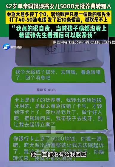 河南郑州,42岁单亲妈妈带女儿看病,转账付费时,竟然多按了个0,误将女儿5000元抚养费转错人,转给账户只差一位数的张先生,她打了40-50通电话,发了近10条信息,对方都不回应!女子哭诉:我真的很自责,孩子病都没看上,希望能还给我,哪怕给你包个红包也可以!” 这事儿听着就让人心里堵得慌。单亲妈妈带孩子本就不容易,那5000块钱还是女儿的抚养费,说是救命钱都不为过。想想她当时的心情,抱着生病的孩子,急着缴费看病,手指一抖多按了个0,钱嗖地一下到了别人账户里,那瞬间估计脑子都懵了。 她肯定是一边心疼钱,一边更急着孩子的病。打几十通电话,发近10条信息,每条信息里估计都带着哭腔,把自己的难处一五一十说清楚,就盼着对方能通点情理。可那边呢,电话不接,信息不回,就跟没这回事儿一样。这哪是没看见啊,多半是揣着明白装糊涂,觉得这笔“天上掉的钱”不拿白不拿。 但话说回来,这钱拿着能踏实吗?明知道是别人给孩子看病的救命钱,揣进自己兜里,晚上能睡得着觉?法律上早就说清楚了,这种错转的钱属于不当得利,是必须要还的。真要是闹到派出所,甚至法院,到时候不仅得还钱,脸也丢尽了,划算吗? 咱也能理解这位妈妈的自责,换谁碰上这种事都得怪自己粗心。可话说回来,谁还没个手忙脚乱的时候?尤其是带着生病的孩子,心里火急火燎的,出错也难免。她愿意给对方包红包,就是怕人家觉得白还回来亏了,这份小心翼翼,看着真让人心疼。 希望那位张先生能早点想明白,把钱还回去。对他来说可能就是笔意外之财,可对这对母女来说,那是孩子的药钱,是过日子的底气。别让这点钱,凉了人心。 各位读者你们怎么看?欢迎在评论区讨论。