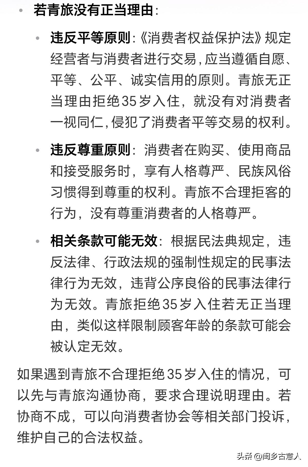30~40岁的男性可以住,30~40岁的女性却禁止入住青旅特价房,这家青旅为什么搞性别歧视?青旅真的有权利决定想不接待什么样的人,就可以不接待吗! 某网友分享,自己被成都某青旅歧视了,因超过了店家规定年龄,不能定特价房。 对此青旅的工作人员解释,他们有权利决定不去接待什么样的人! 青旅说的话,乍一看还真的是没有毛病,我自己开的店,我想接待谁是我的权利,我不想接待,凭什么就要让你入住呢? 但青旅却忘记了,这是一个法治社会!每个人都需要遵守相关的法律。 查了一下,如果青旅拒绝年龄大的消费者入住,是有正当理由,那他们是可以拒绝的。 但要是认为自己有权利决定,不让哪个年龄段的群体入住,那就违反《消费者权益保护法》规定的平等、尊重原则了! 所以很显然这家青旅并不能以他们的低价房需要下载app、需要分享,需要花十至二十分钟的理由,去拒绝女的30岁以上,男的40岁以上消费者入住。 30岁以上女子,40岁以上男子,他们就不会下载,不会分享吗? 另外,40岁以上的男性就不说了,40岁以上是中老年,不适合青旅“青”的初衷。 那为什么30-40岁的男子可以入住,30岁以上40岁以下的女性却不让住? 这已经不单是年龄歧视的问题,更是性别歧视了! 因此消费者完全可以向当地的消协举报投诉。