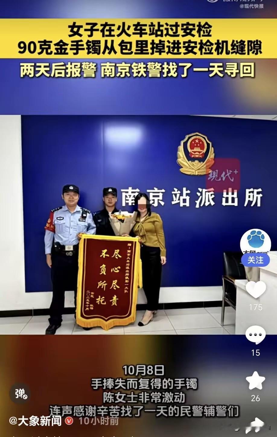 1. 女子乘车丢失90克金手镯 民警帮寻回:10月7日中午,南京站派出所接陈女士报警,其约90克金手镯可能于5日乘车时丢失,排查发现过安检掉进夹缝,到现场已不见。民警通过视频发现保洁员疑似捡走,保洁员称捡到后等失主认领。8日陈女士拿回手镯,13日送锦旗致谢。网友讨论此事,提醒保管好贵重物品,也赞警察效率高。
